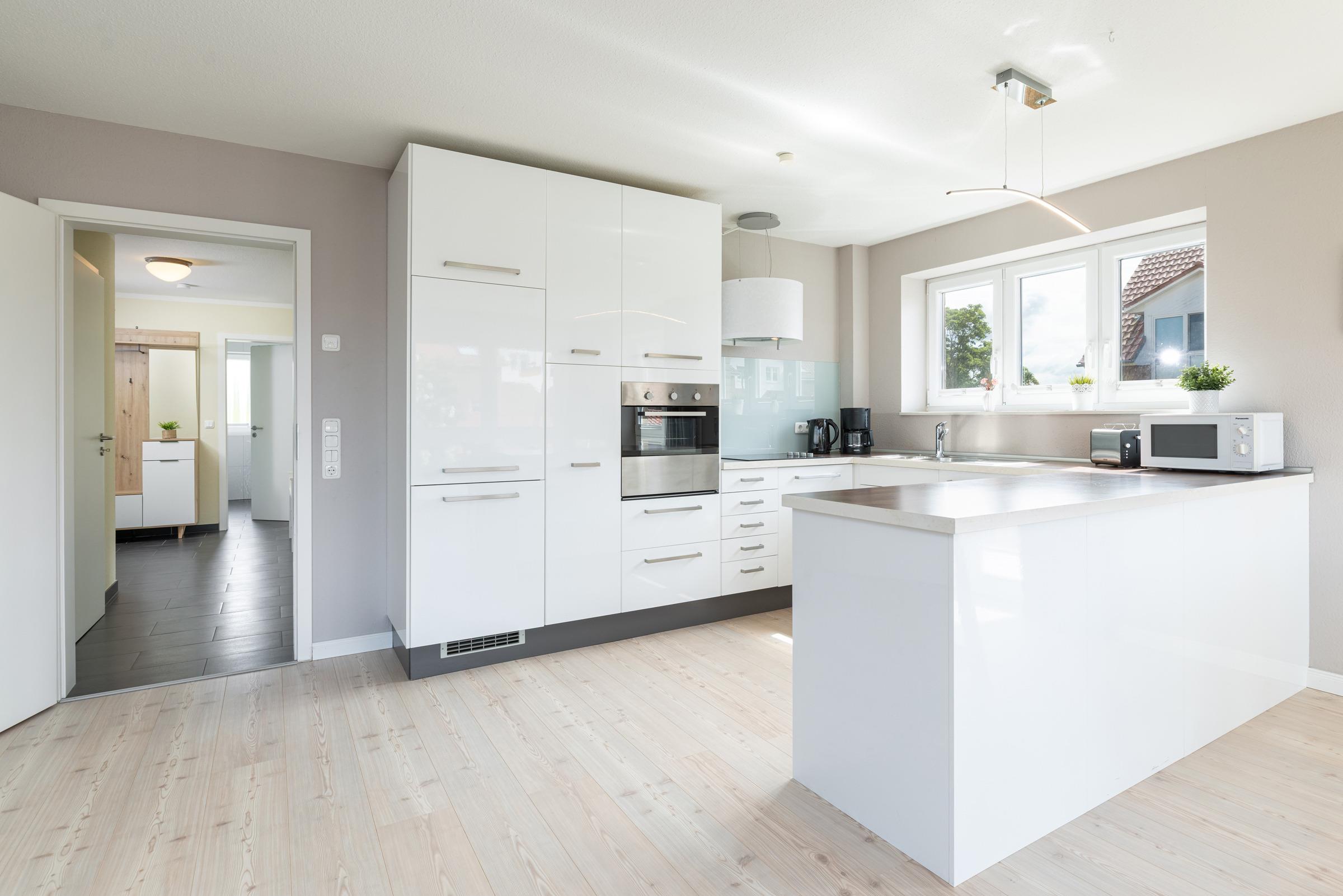 Die offene Küche ist vollständig ausgestattet: Ceranfeld, Backofen, Kühlschrank mit Gefrierfach, Spülmaschine, Kaffeemaschine, Toaster, Mixer, Wasserkocher und weitere Küchenhelfer stehen Ihnen zur Verfügung. Der angrenzende Essbereich bietet ausreichend Platz für gemeinsame Mahlzeiten.