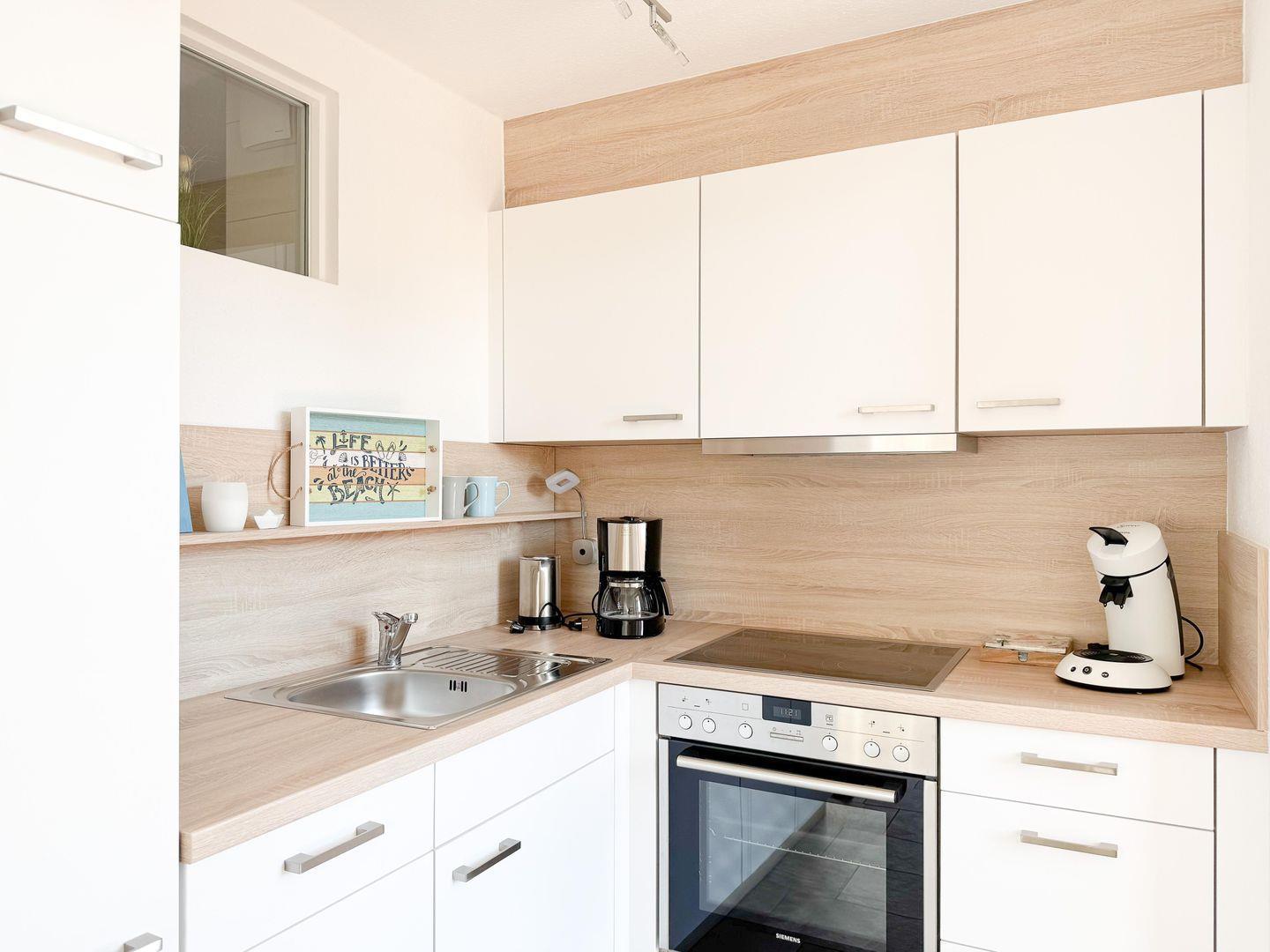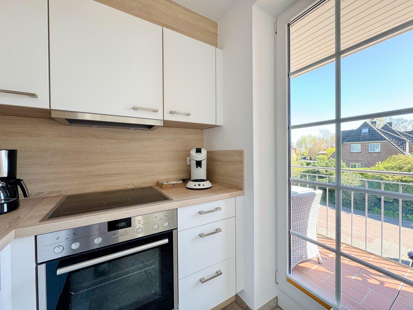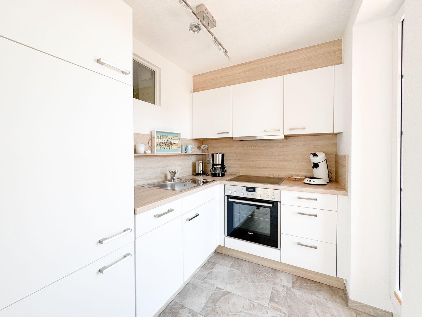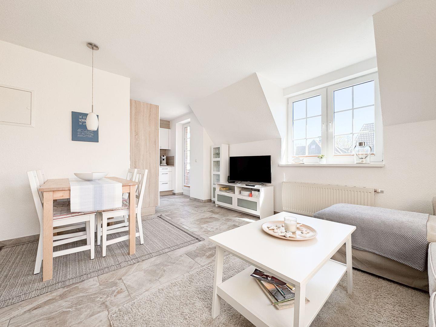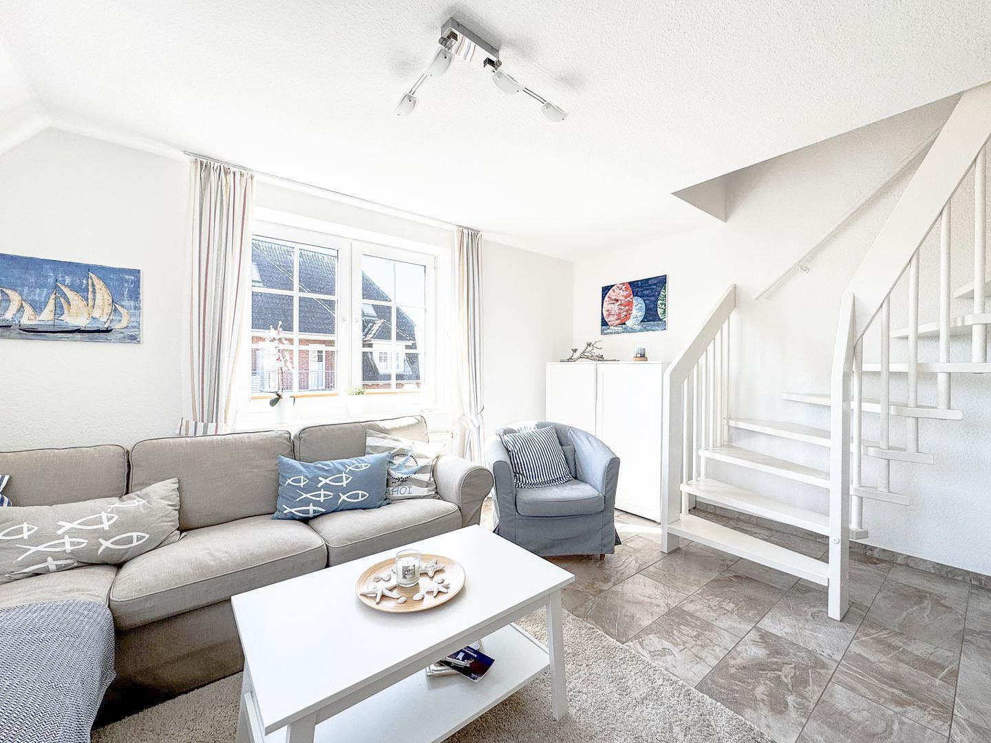 Die Wohnung erstreckt sich über zwei Etagen und besticht durch eine durchdachte Raumaufteilung. Im ersten Stock erwartet Sie ein helles, einladendes Wohnzimmer mit einer komfortablen Sofaecke, einem Essbereich und einem großen, überdachten Balkon. Hier können Sie bei einem Glas Wein entspannen und den Blick ins Grüne genießen. Die offene Küche ist mit modernen Geräten wie einem Kühlschrank, einem Geschirrspüler, einer Espressomaschine und einem 4-Platten-Herd ausgestattet, sodass Sie auch im Urlaub köstliche Gerichte zaubern können. Die beiden gemütlichen Schlafzimmer im 2.OG laden nach einem erlebnisreichen Tag zum Ausruhen ein und sind ideal, um neue Energie zu tanken.