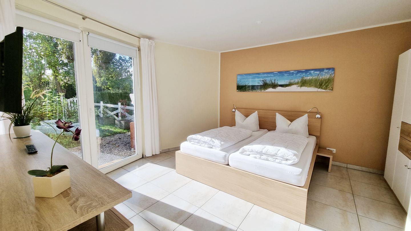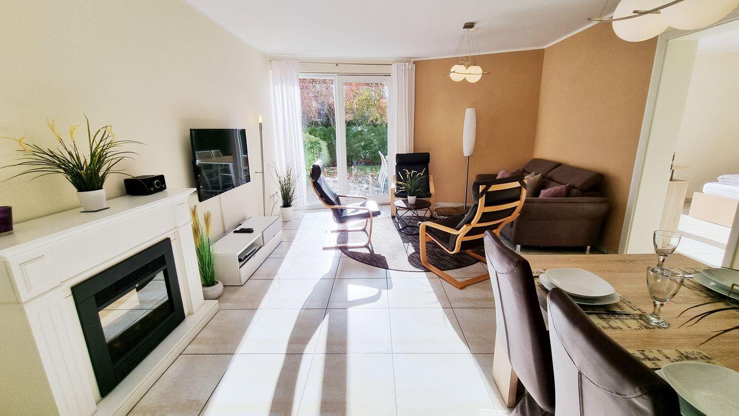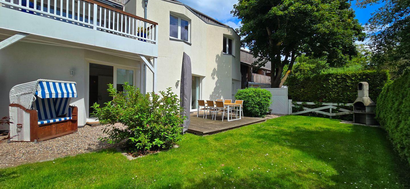 Moderne Erdgeschoss Ferienwohnung „Baltic Sunshine“ punktet mit großem, eingezäunten Sonnengarten nebst Terrasse in direkter Nähe zum Ostseestrand.