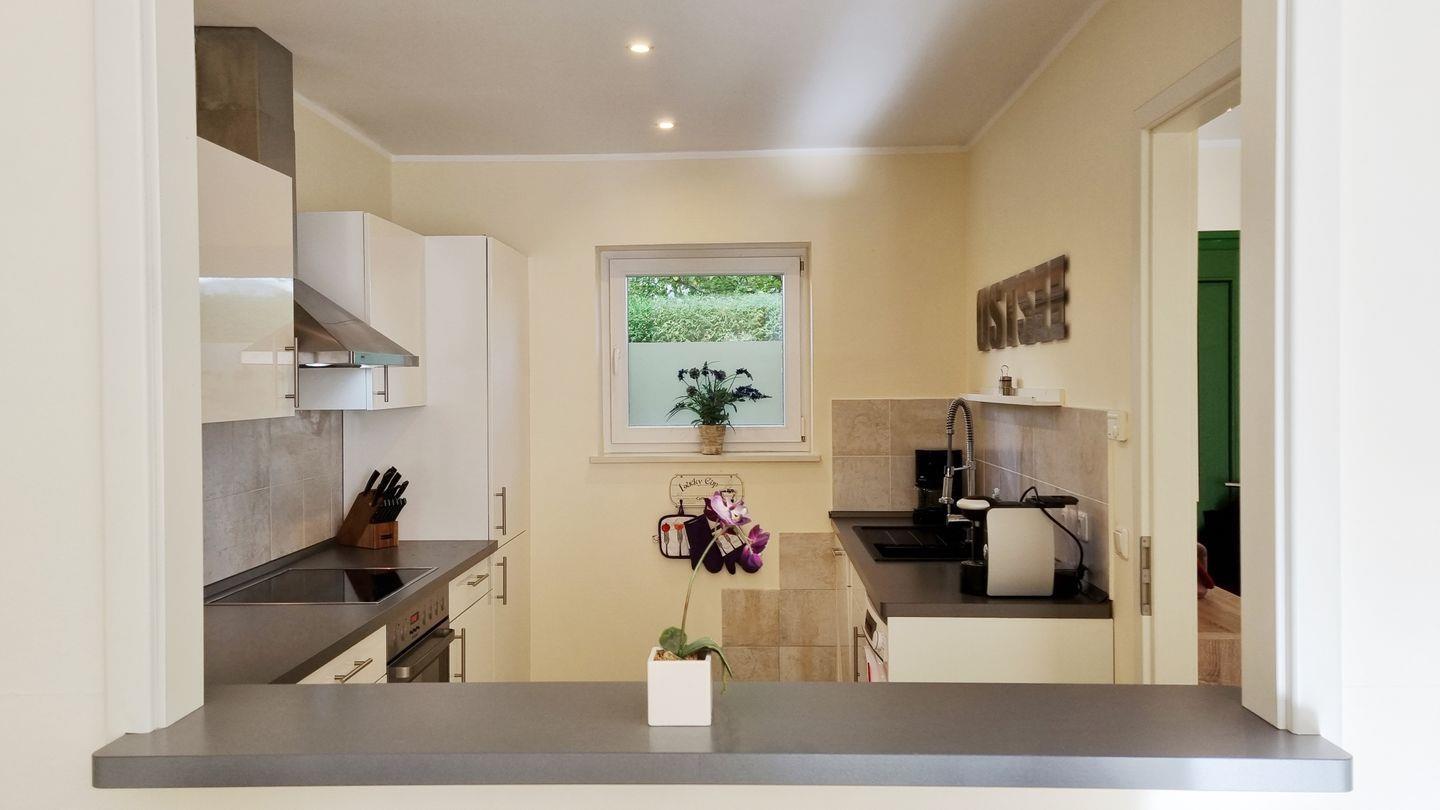 Die hochwertige, vollausgestattete Küche wird durch eine große Durchreiche in den Wohnbereich und ein Fenster auf der gegenüberliegenden Seite mit Helligkeit versorgt.