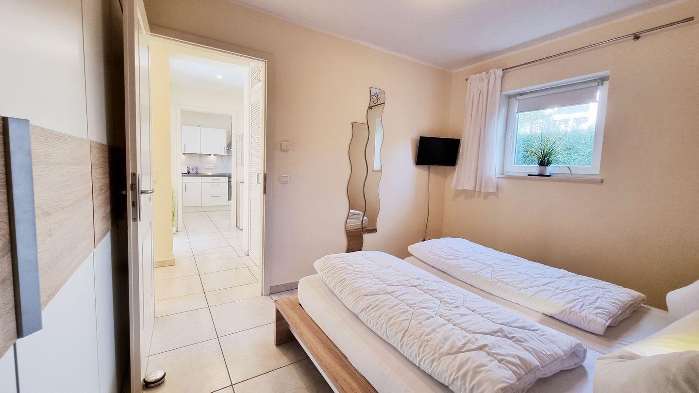 Schlafzimmer I: Doppelbett (180x200cm) / Schrank / Kommode / Fernseher / Gardinen / Rollo / Bad en Suite