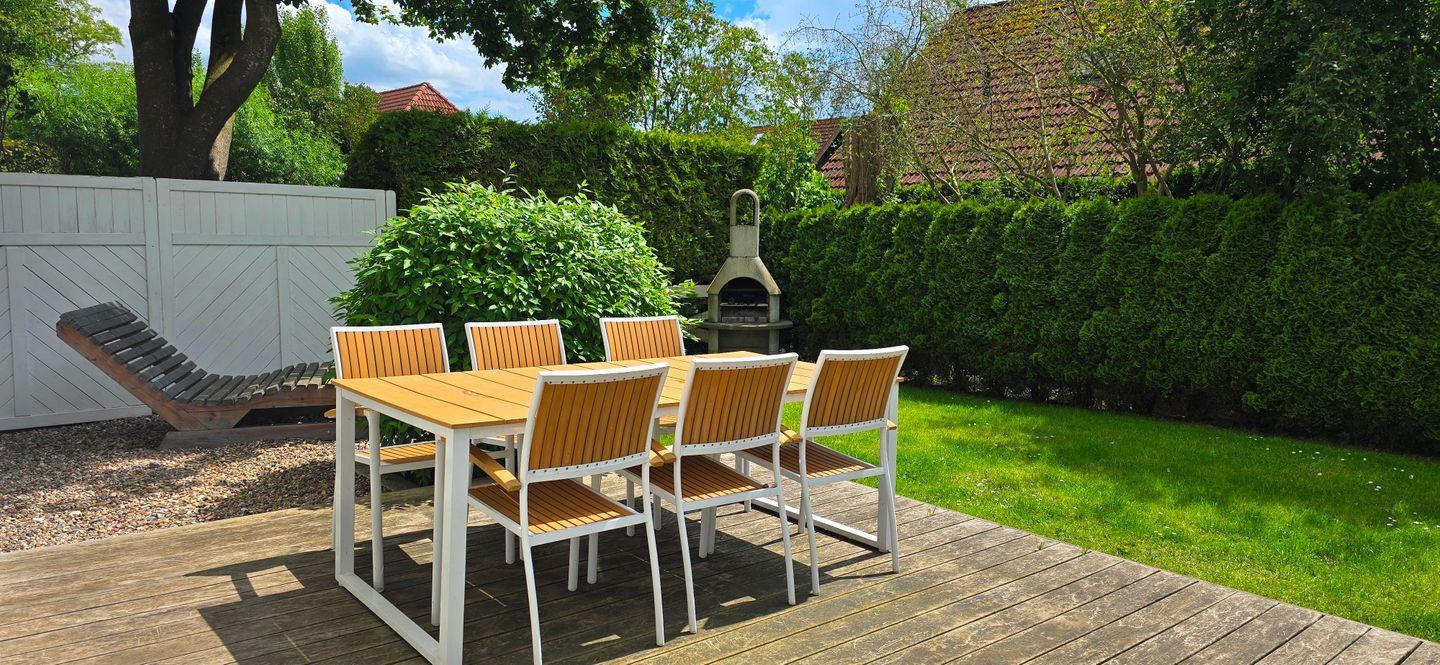 Im Garten findet sich neben der Liegewiese und Terrasse ein Strandkorb, sowie eine Wellenliege zum gemütlich in der Sonne sitzen. Selbstverständlich darf ein Grill für kulinarische Highlights nicht fehlen.