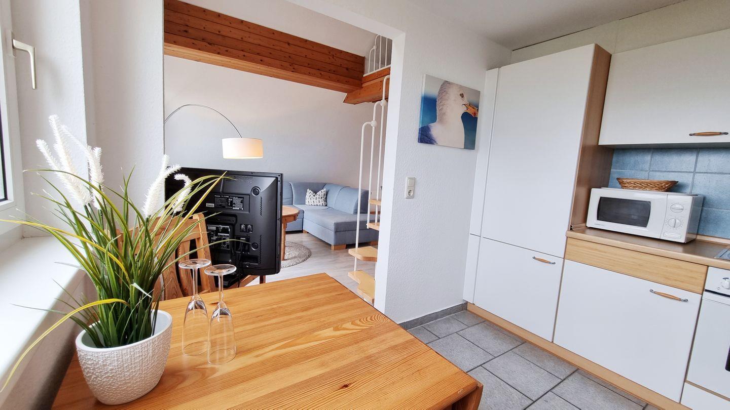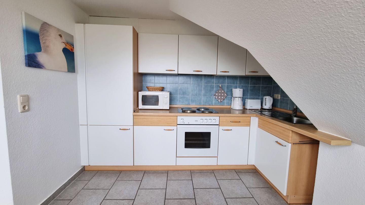 offene Küche: 4-Platten-Herd / Backofen / Mikrowelle / Toaster / Filterkaffeemaschine / Wasserkocher / Kühlschrank mit Gefrierfach