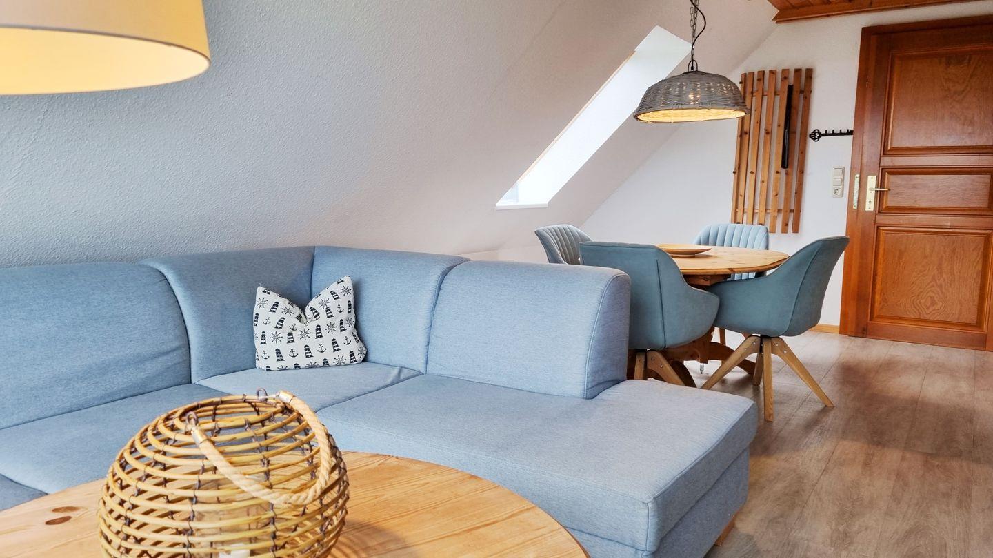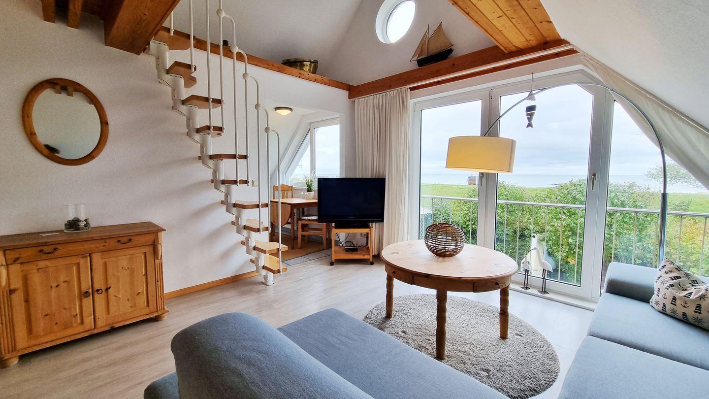 Wohn-Essbereich: gemütliche Eckcouch / Fernseher / Esstisch / 4 Stühle / Meerblick