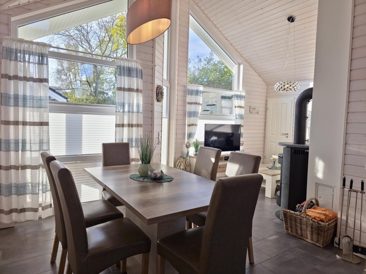 Wohn- Essbereich: gemütliche Eckcouch / Fernseher / Kaminofen / Esstisch / 6 Stühle / große Fensterfronten