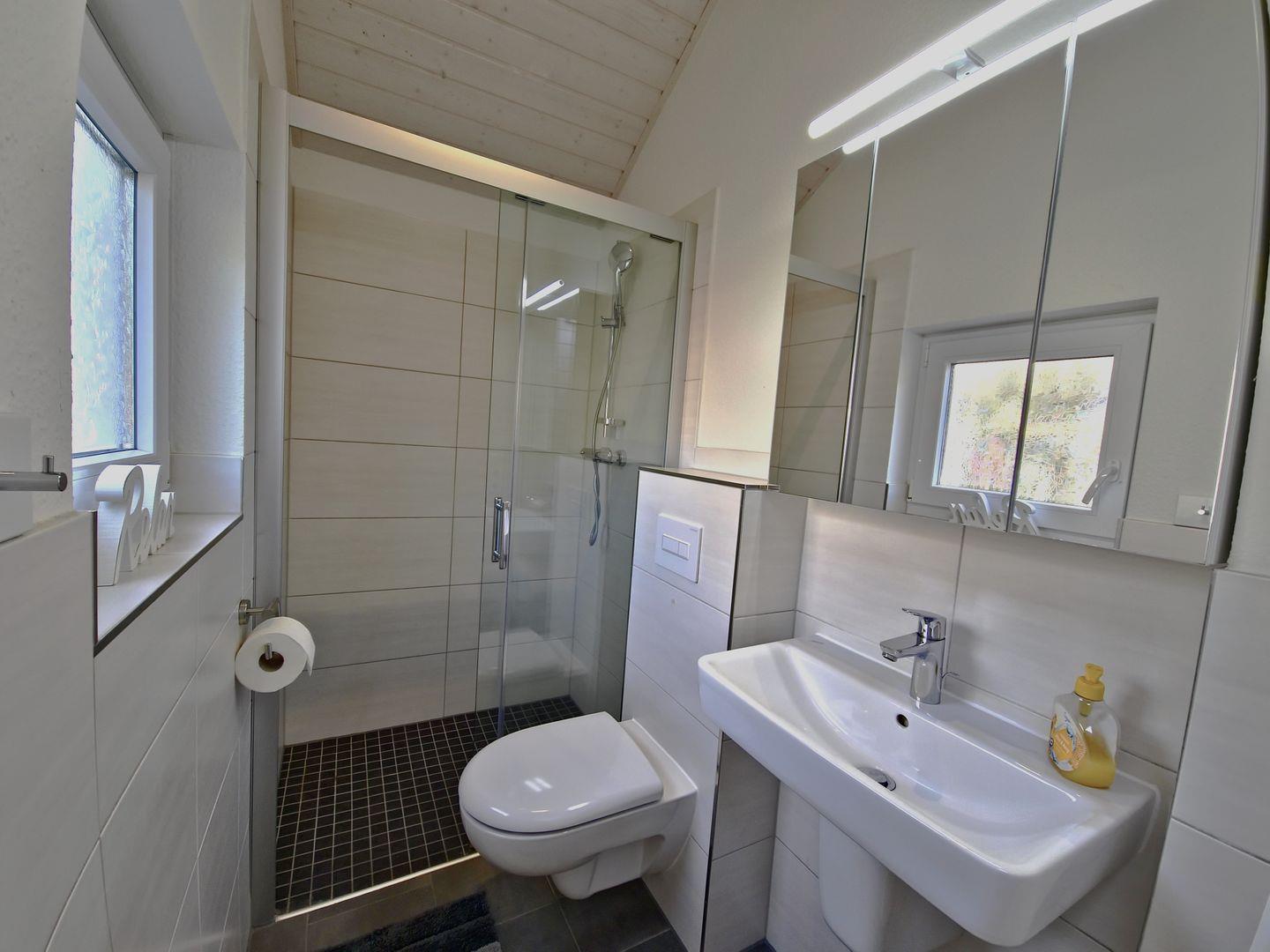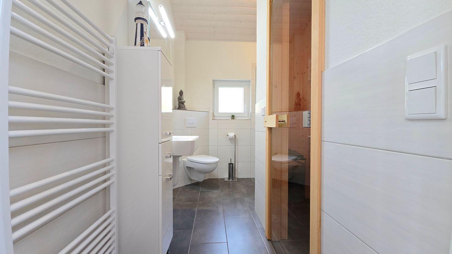 Badezimmer I: ebenerdige Dusche / Waschbecken / WC / Föhn / Handtuchheizkörper / Sauna