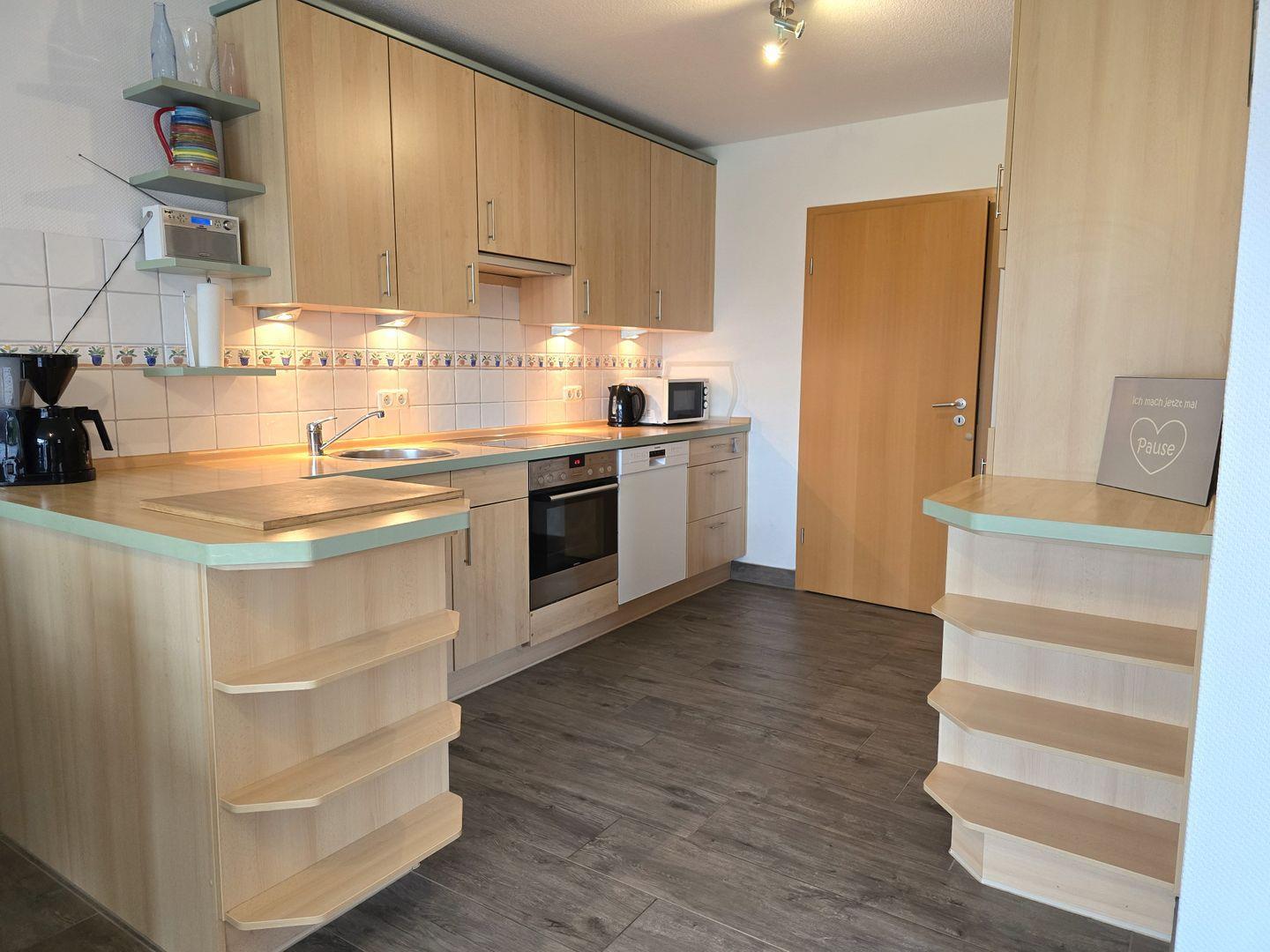 Küche: große Küche / Cerankochfeld / Dunstabzugshaube / Backofen / Mikrowelle / Toaster / Filterkaffeemaschine / Wasserkocher / Geschirrspüler / Kühlschrank / separierter halber Gefrierschrank mit 3-Fächern / Mixer