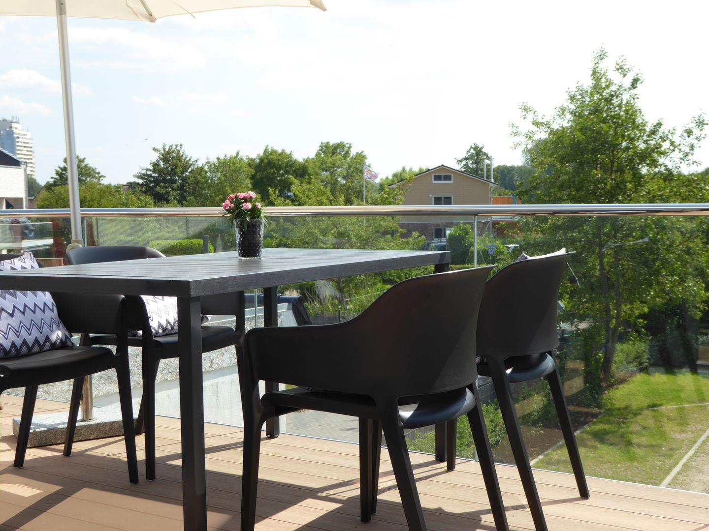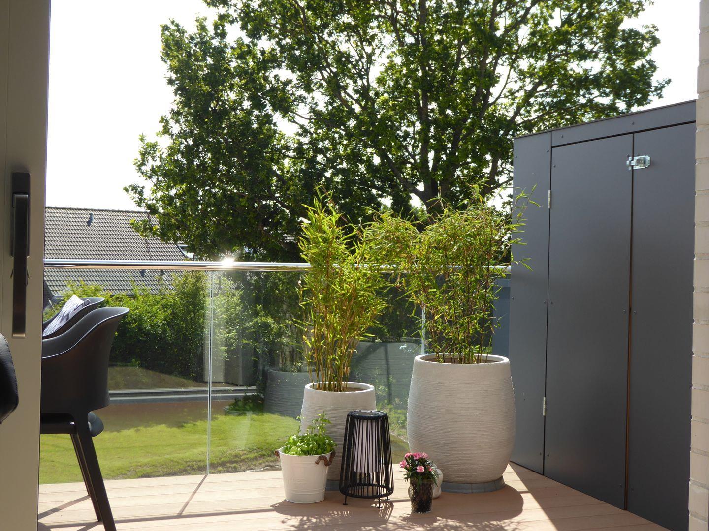 Balkon: Tisch / 4 Stühle / halbhohe Lagerkammer