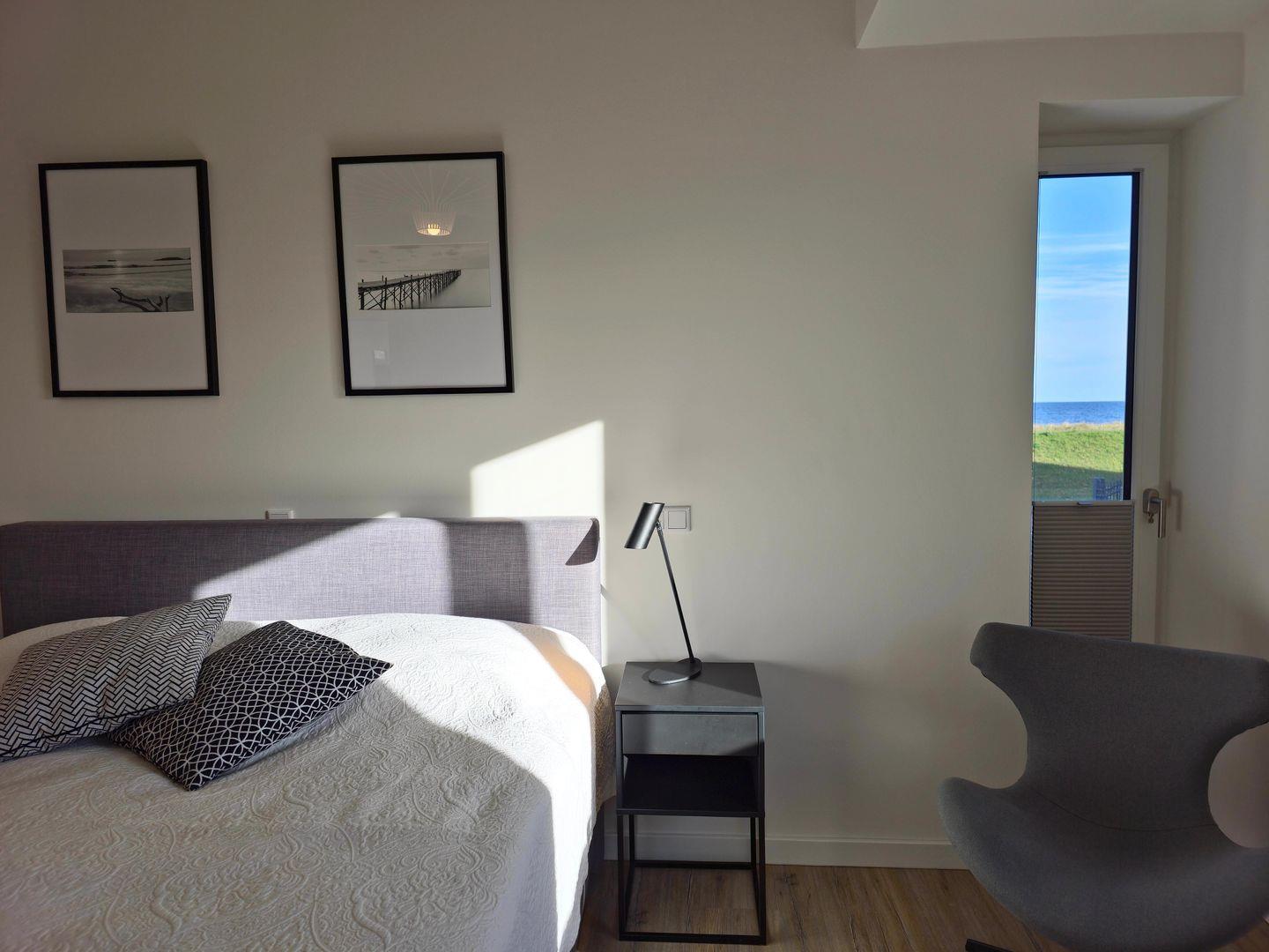 Schlafzimmer: Doppelbett (180x200) / Schrank / Sessel / Schreibtisch mit Stuhl / Plissees / Meerblick