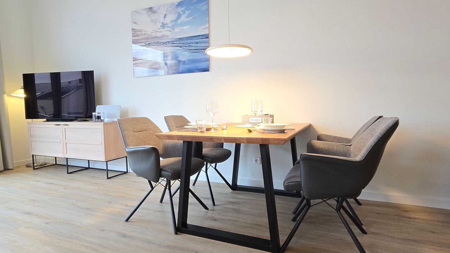 Wohn- Essbereich: gemütliche Couch / Fernseher / Esstisch / 4 Stühle