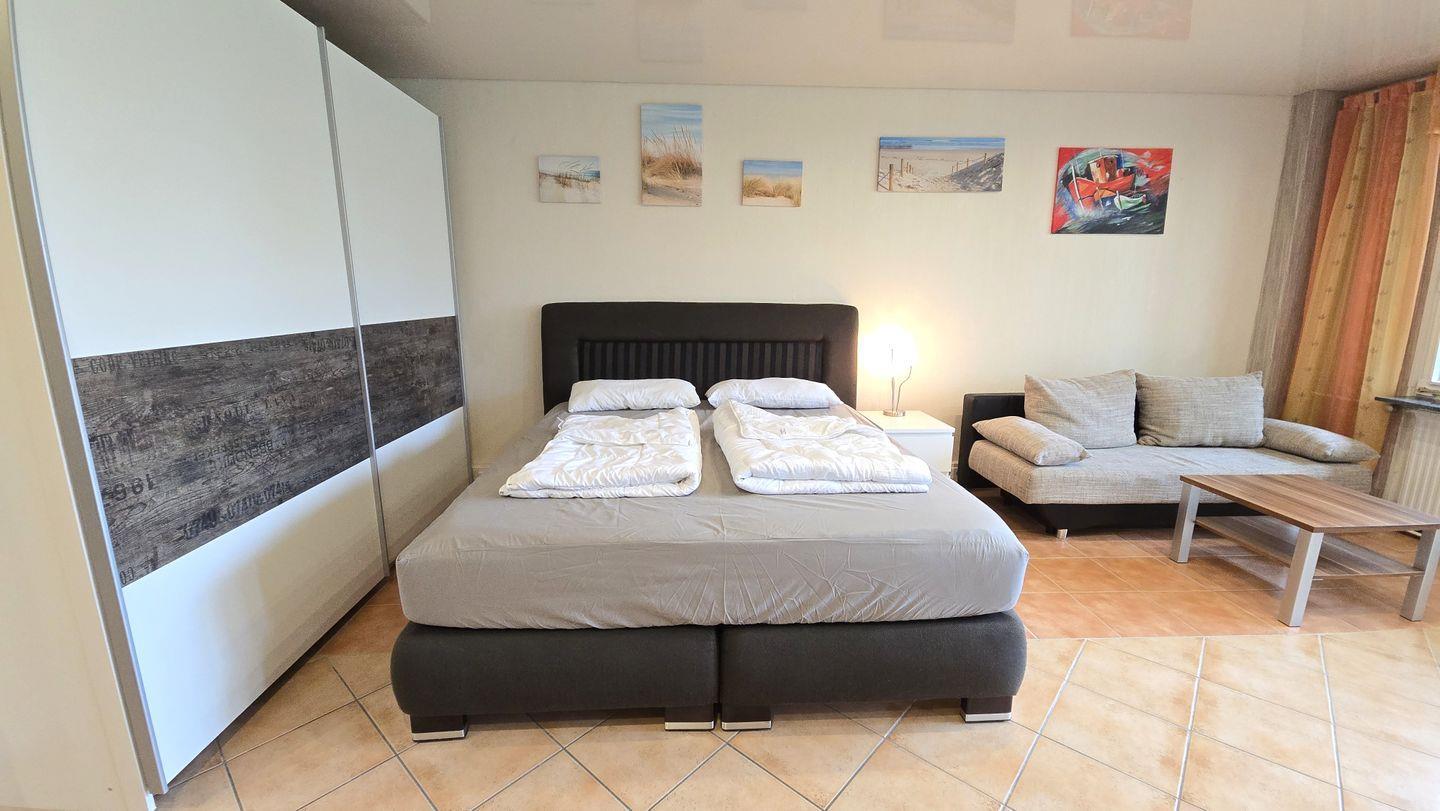 Wohn-/Essbereich: Schlafcouch (130x200cm) / Schlafsessel (80x200cm) / Fernseher / Esstisch / 4 Stühle