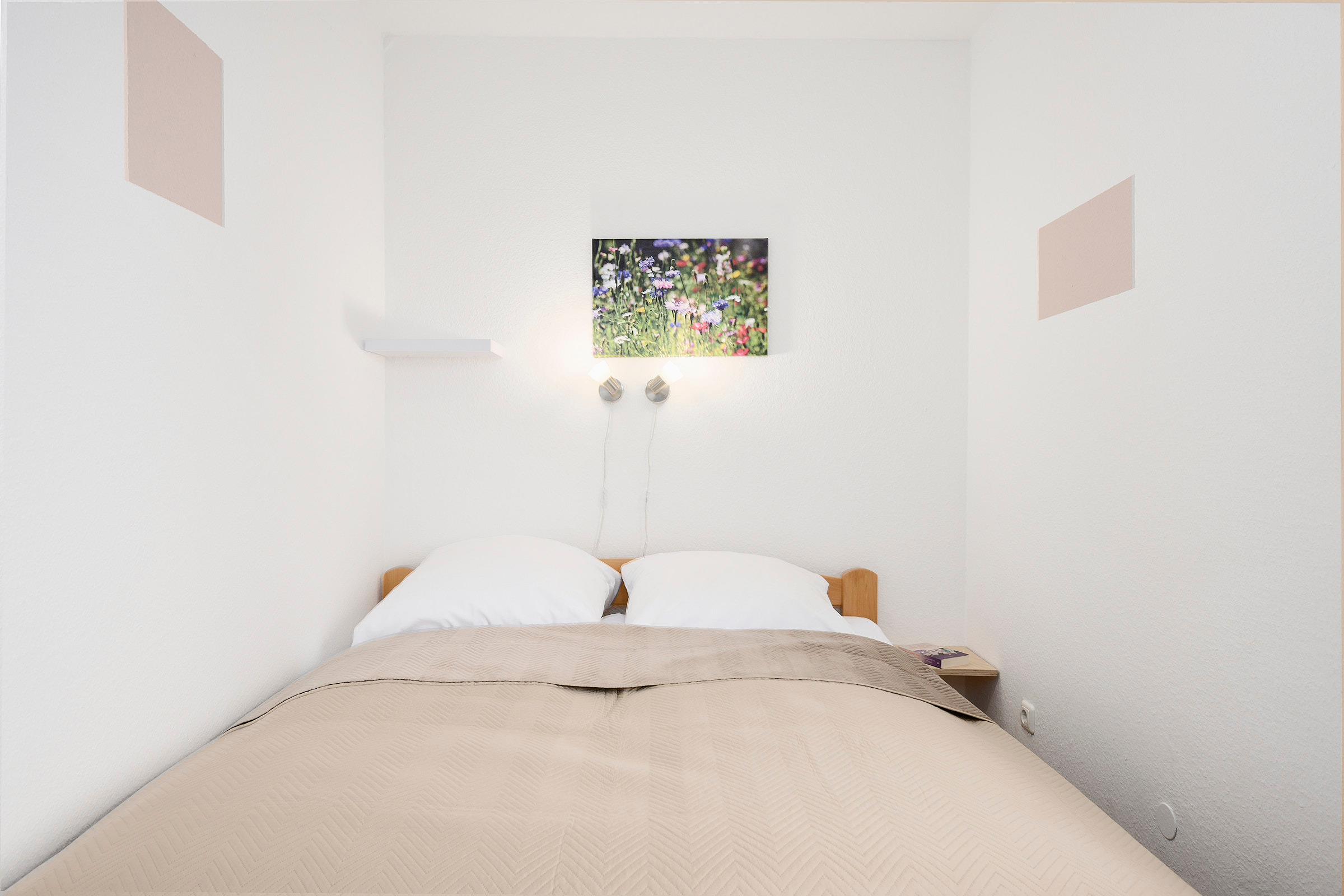 Schlafzimmer 1: kleines Doppelbett (160x200 cm), Kleiderschrank, Verdunkelung: Rollo