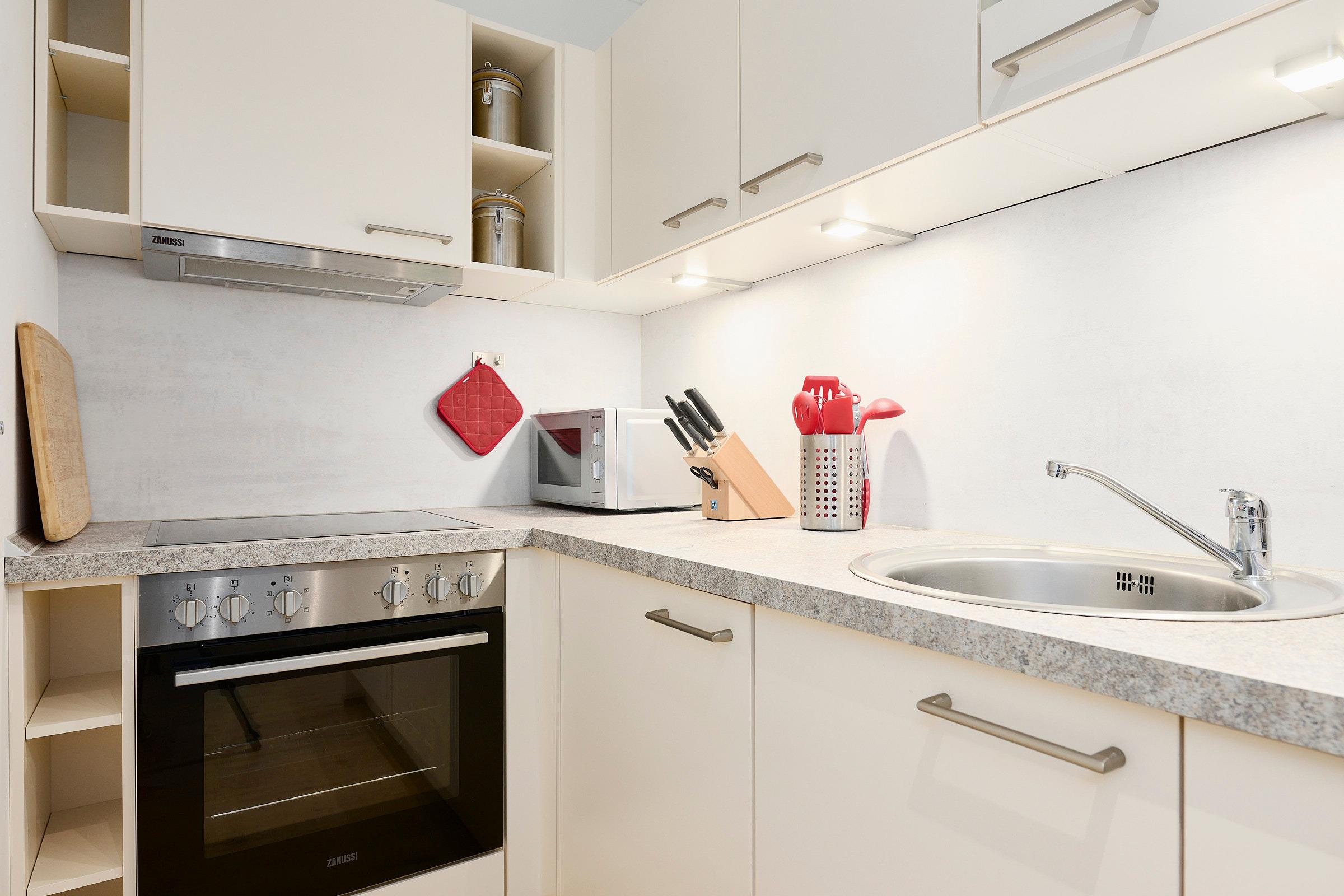 Vom Wohnzimmer können Sie direkt auf den Balkon treten. Machen Sie es sich hier auf den mit bequemen Gartenmöbeln gemütlich. Die Küche ist mit allem Komfort ausgestattet. Im ersten Schlafzimmer befindet sich ein Doppelbett (160x200 cm), ein Kleiderschrank ausgestattet. Das zweite Schlafzimmer ist mit einem Einzelbett (90x200 cm) sowie einer Kommode ausgestattet. Beide Schlafräume können durch elektrischen Rolladen verdunkelt werden.