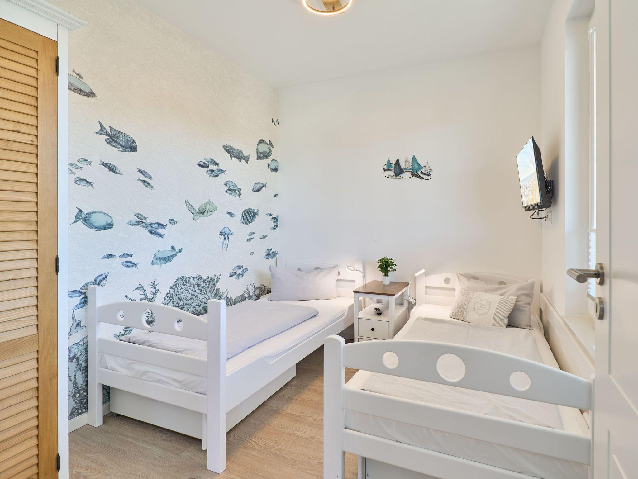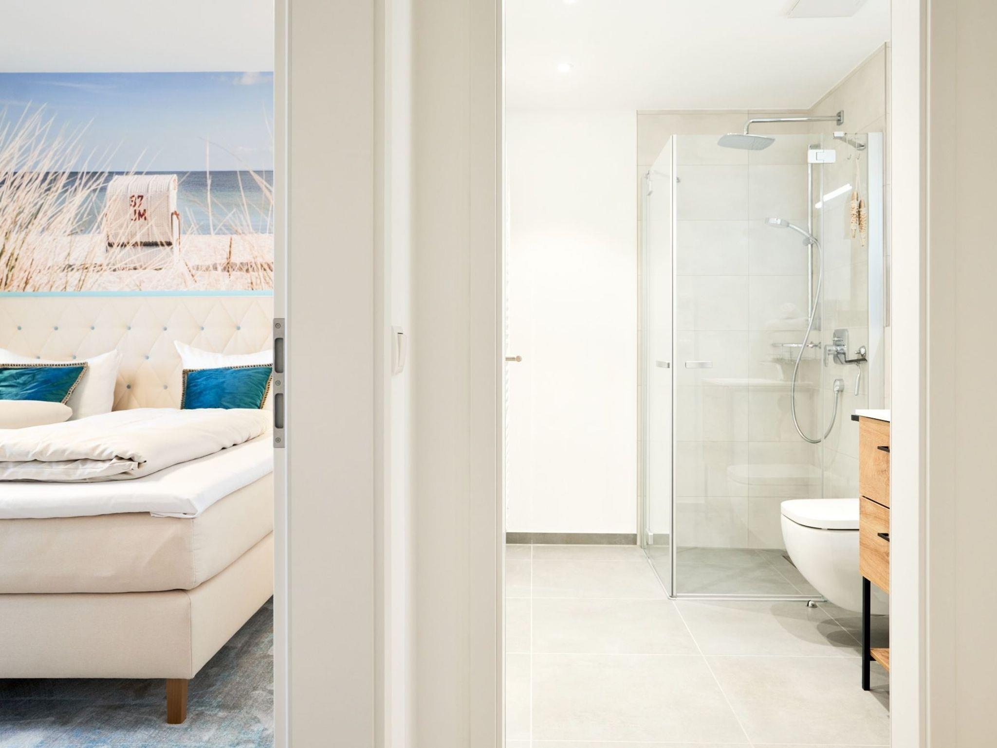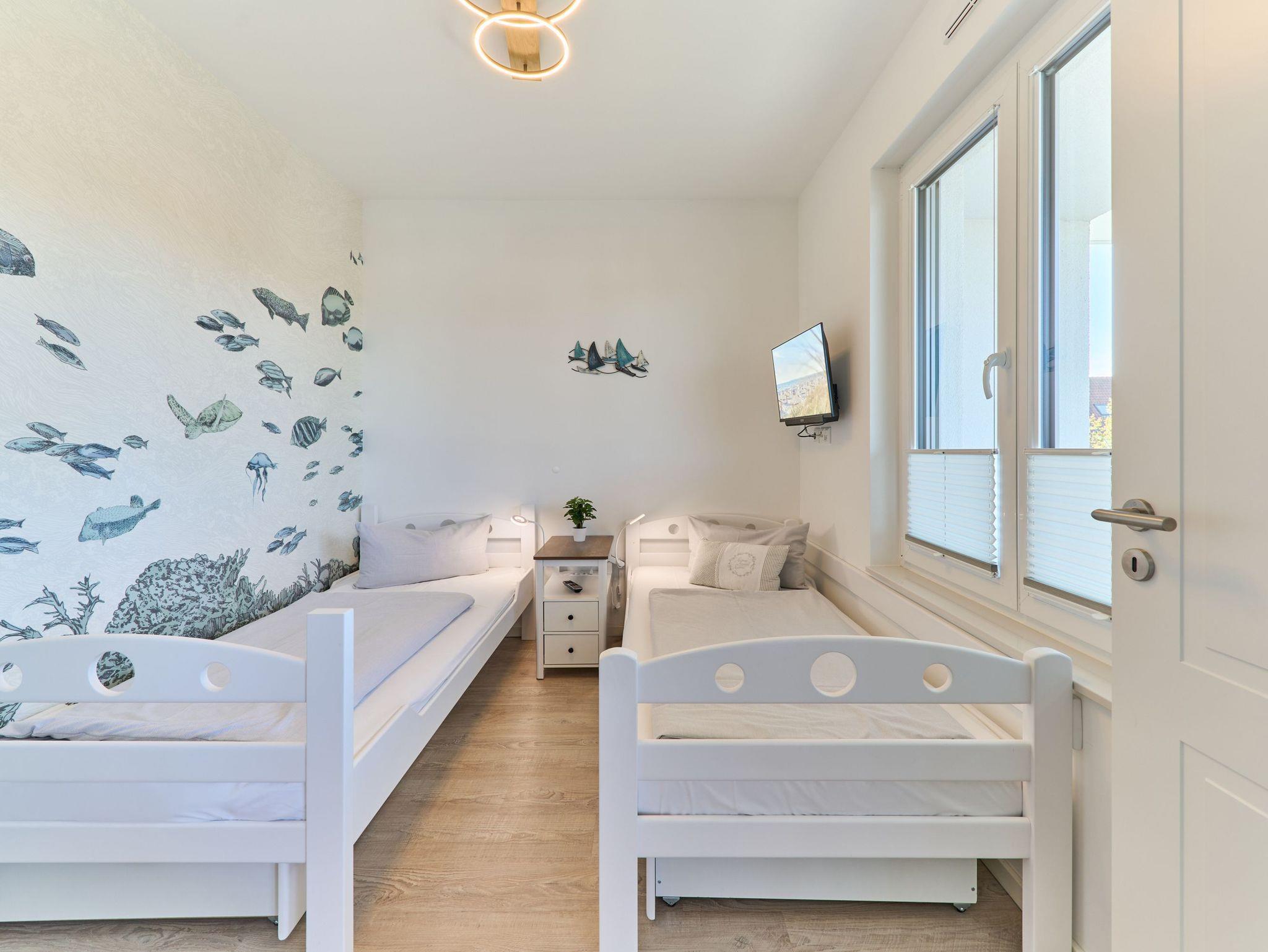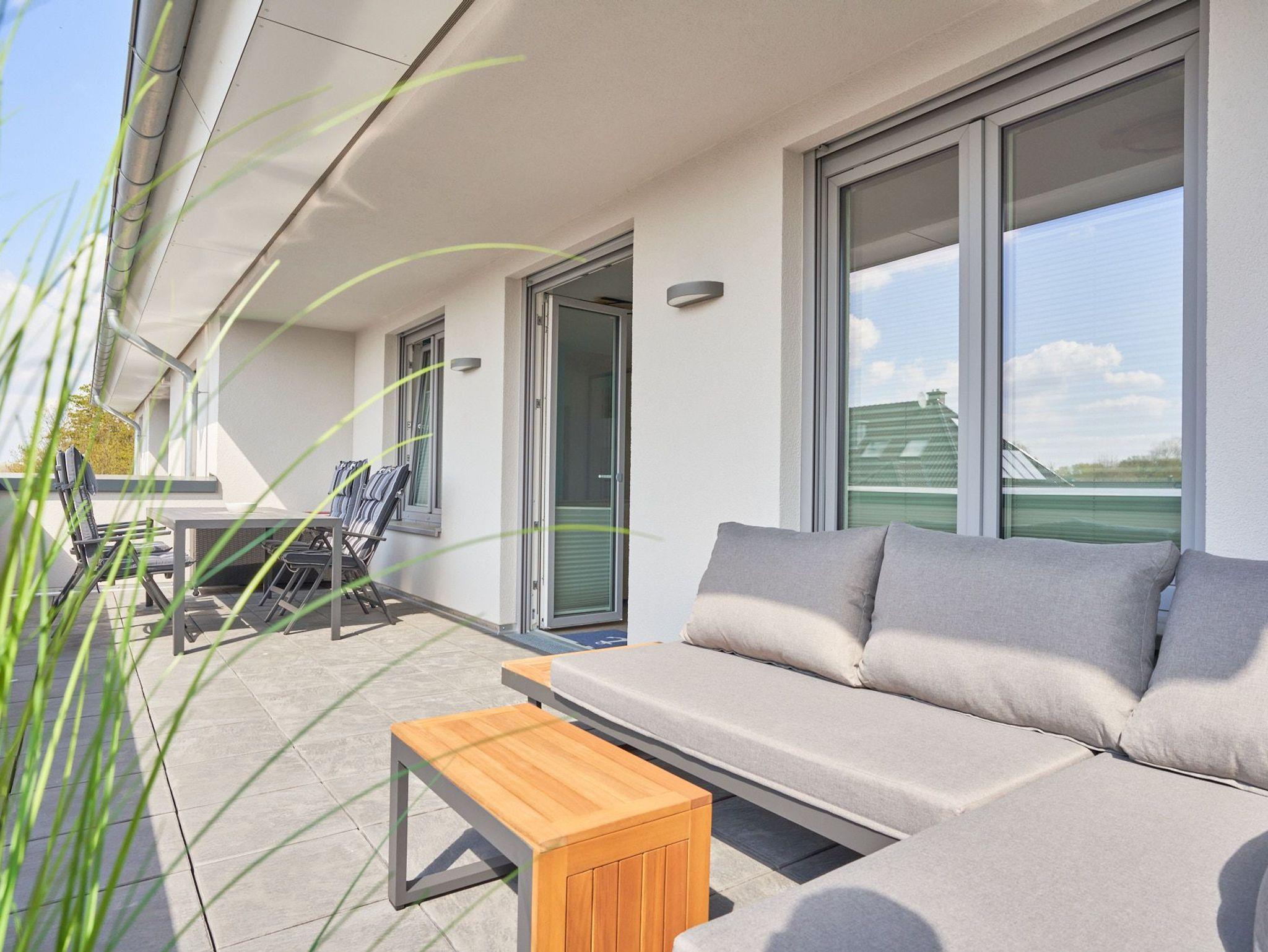 Die Küchenzeile hat einen Backofen, ein Ceran-Kochfeld, einen Geschirrspüler, einen Kühlschrank mit Gefrierschrank, eine Filterkaffeemaschine, eine Senseo-Kapselmaschine, einen Toaster und einen Wasserkocher. [nbsp] Der Wohnbereich ist mit einem bequemen Sofa, einem Wohnzimmertisch sowie[nbsp] einem TV ausgestattet. Aus dem Wohnbereich gelangen Sie auf die Dachterrasse nach Westen. Hier stehen Ihnen Tisch und Stühle sowie eine Lounge zur Verfügung. Das 1. Schlafzimmer ist mit einem Boxspringbett ( 1,80m x 2,00m), einem Kleiderschrank, 2 Nachttischen sowie einem Wand-TV eingerichtet. Im 2. Schlafzimmer stehen Ihnen zwei Einzelbetten, ein Wand-TV sowie ein Kleiderschrank zur Verfügung. Alle Fenster haben elektrische Außenrollläden. Das Duschbad in heller Optik mit bodengleicher Dusche / Regendusche mit separater Handbrause, Handtuchheizkörper, Fön, Kosmetikspiegel. Die gesamte Wohnung ist mit einer Fußbodenheizung ausgestattet.