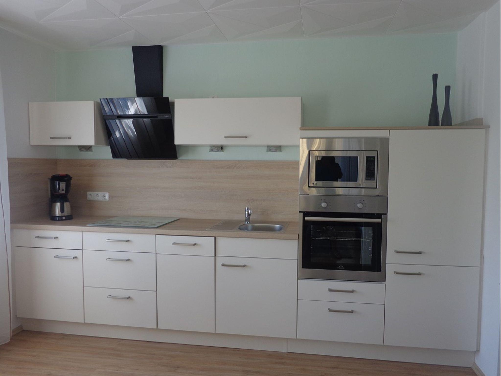 Offener Wohnbereich mit SAT-TV, Radio, Essecke und moderner EBK, inkl. Cerankochfeld, Dunstabzug, Backofen, Mikrowelle, Spülmaschine, Kühlschrank mit Gefrierfach, Kaffeemaschine, Wasserkocher, Toaster, Eierkocher, Mixer