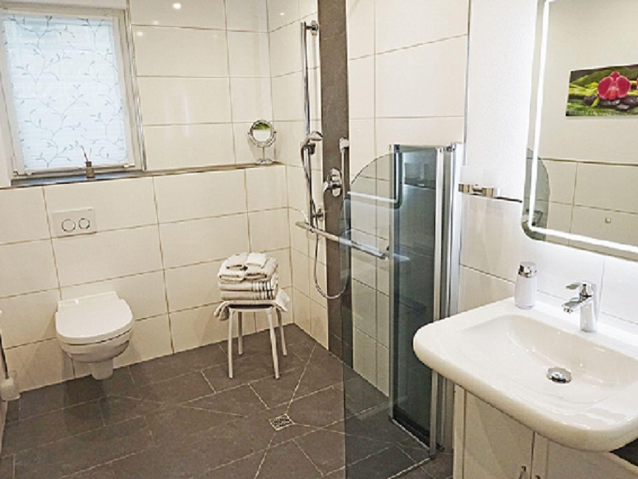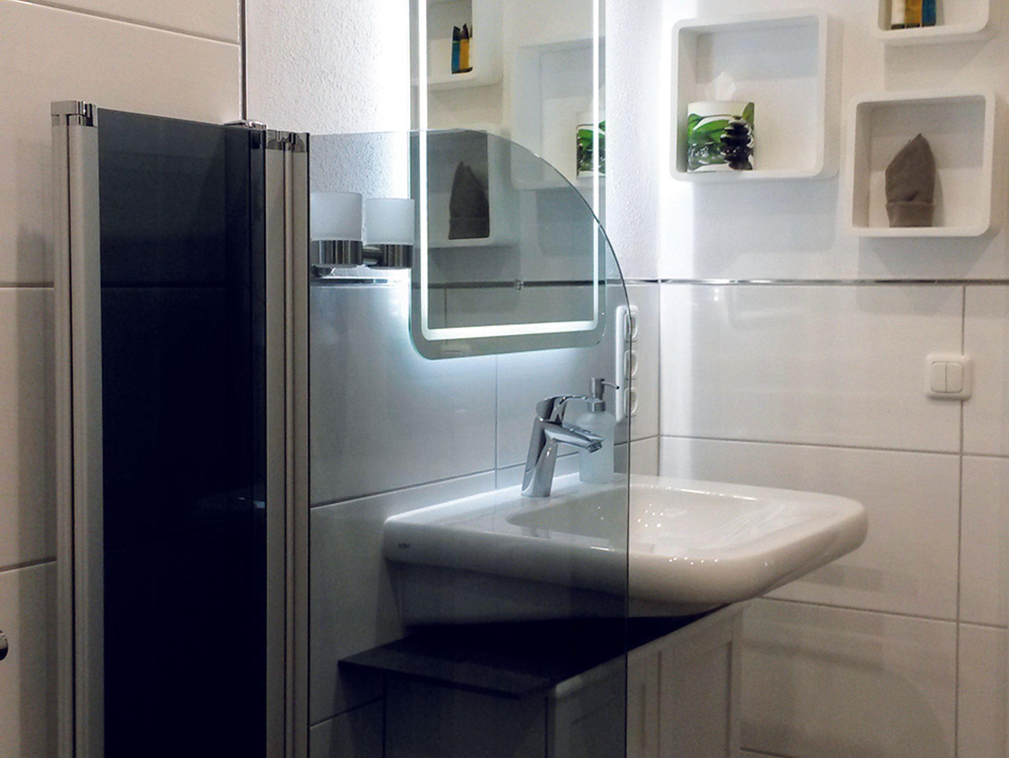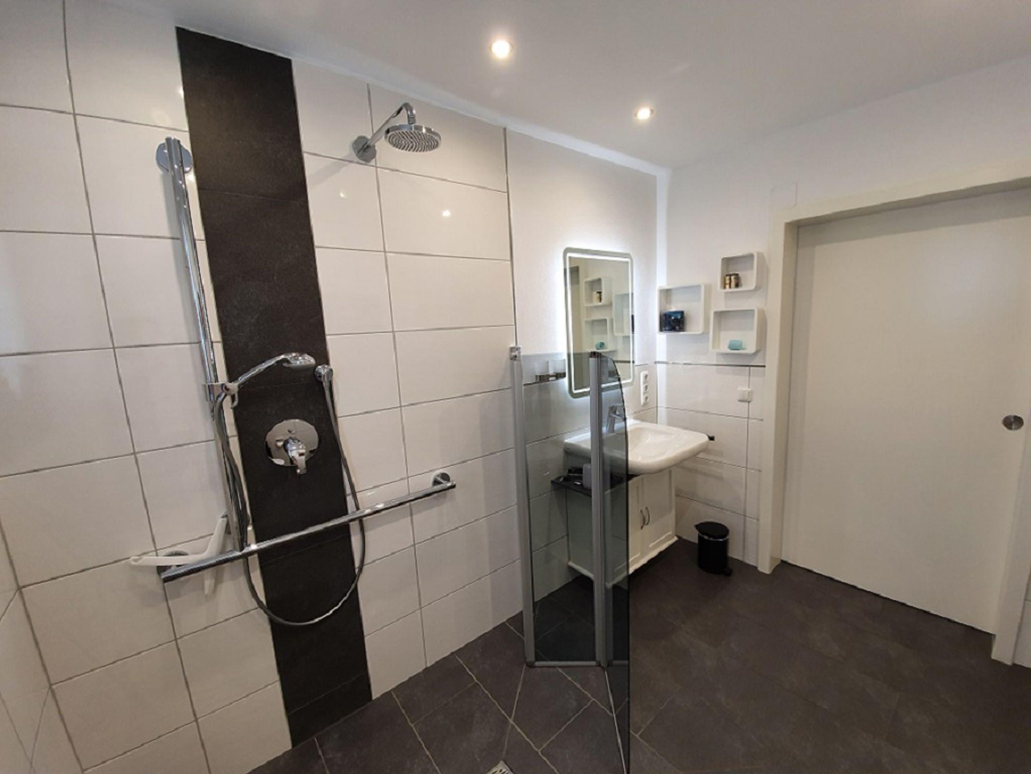 Barrierefreies zeitgemäßes Bad mit Dusche und WC, Fön, Seifenspender, LED-Kosmetikspiegel, Kosmetiktücher
