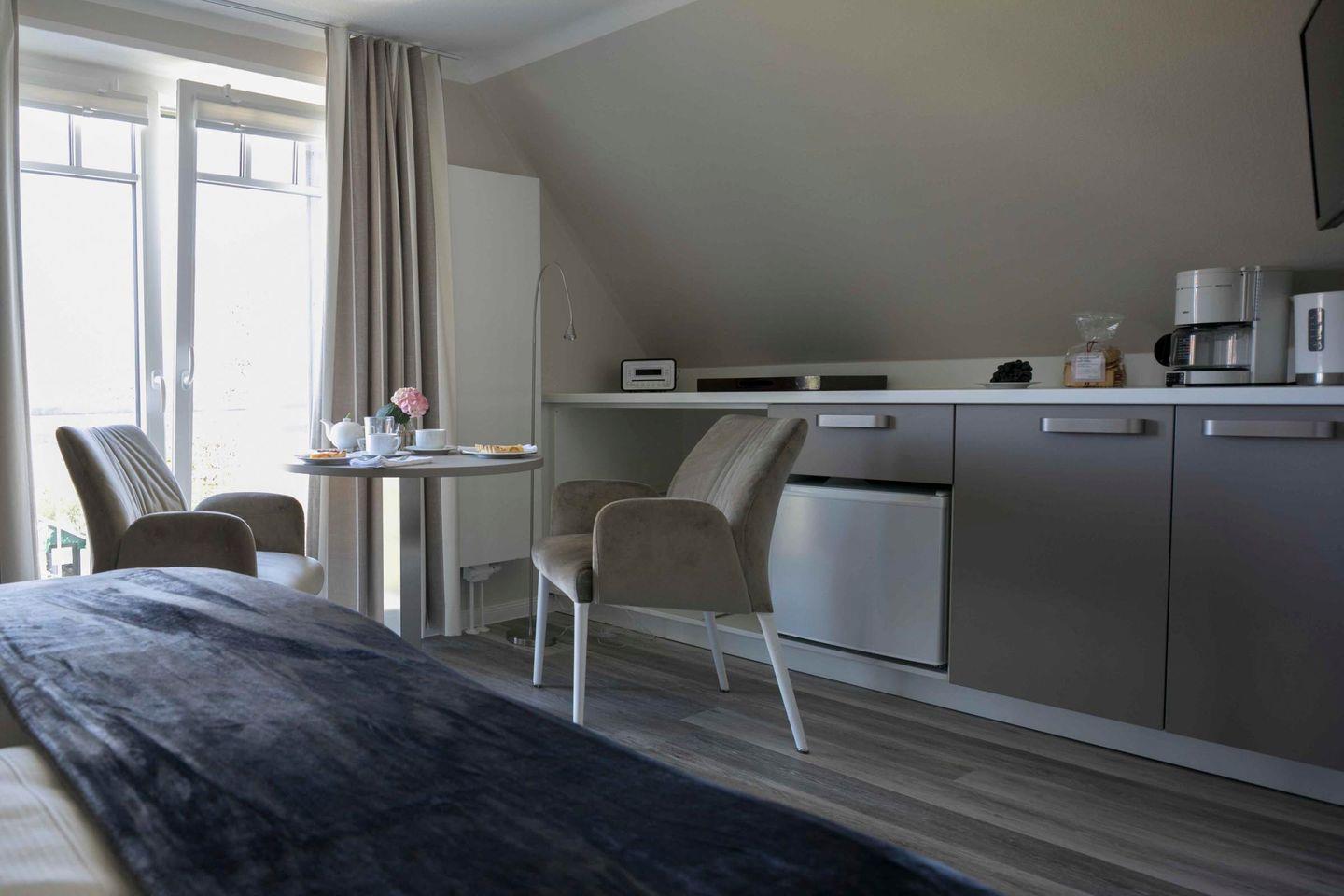 Das Dachgeschosszimmer unseres Gästehauses wurde kürzlich umfassend renoviert. Es bietet ein neues Badezimmer mit Wanne und Dusche. Mit frischen Farben, einem wischbaren Bodenbelag, neuer Einrichtung und einem französischen Balkon modernisiert. Ausgestattet mit einem Boxspring-Doppelbett, Flachbild-TV, Radio/CD-Player, WLAN, Kühlschrank und Teekocher, bietet es eine elegante Urlaubsatmosphäre.