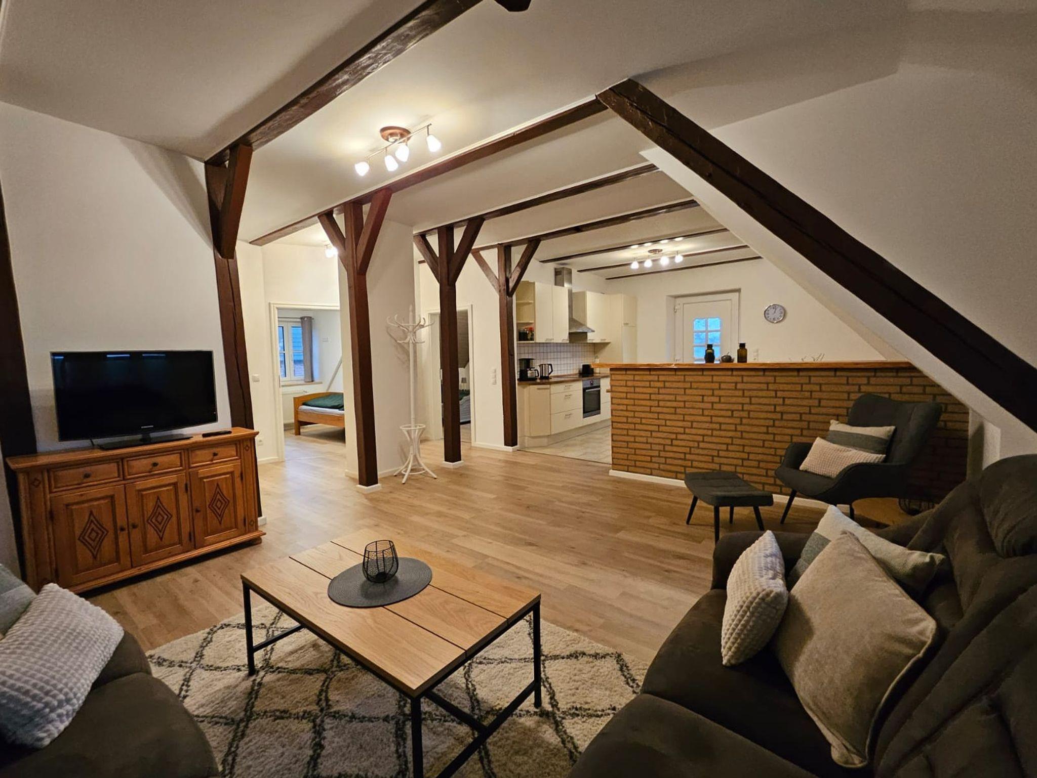 Die Ferienwohnung Mariannenhof für bis zu 4 Personen (plus 1 Kleinkind) befindet sich im Obergeschoss des Herrenhauses und ist über eine Außentreppe und die Dachterrasse erreichbar. Die Wohnung hat ein sehr behagliches Ambiente und bietet einen schönen Ausblick auf die Landschaft.
