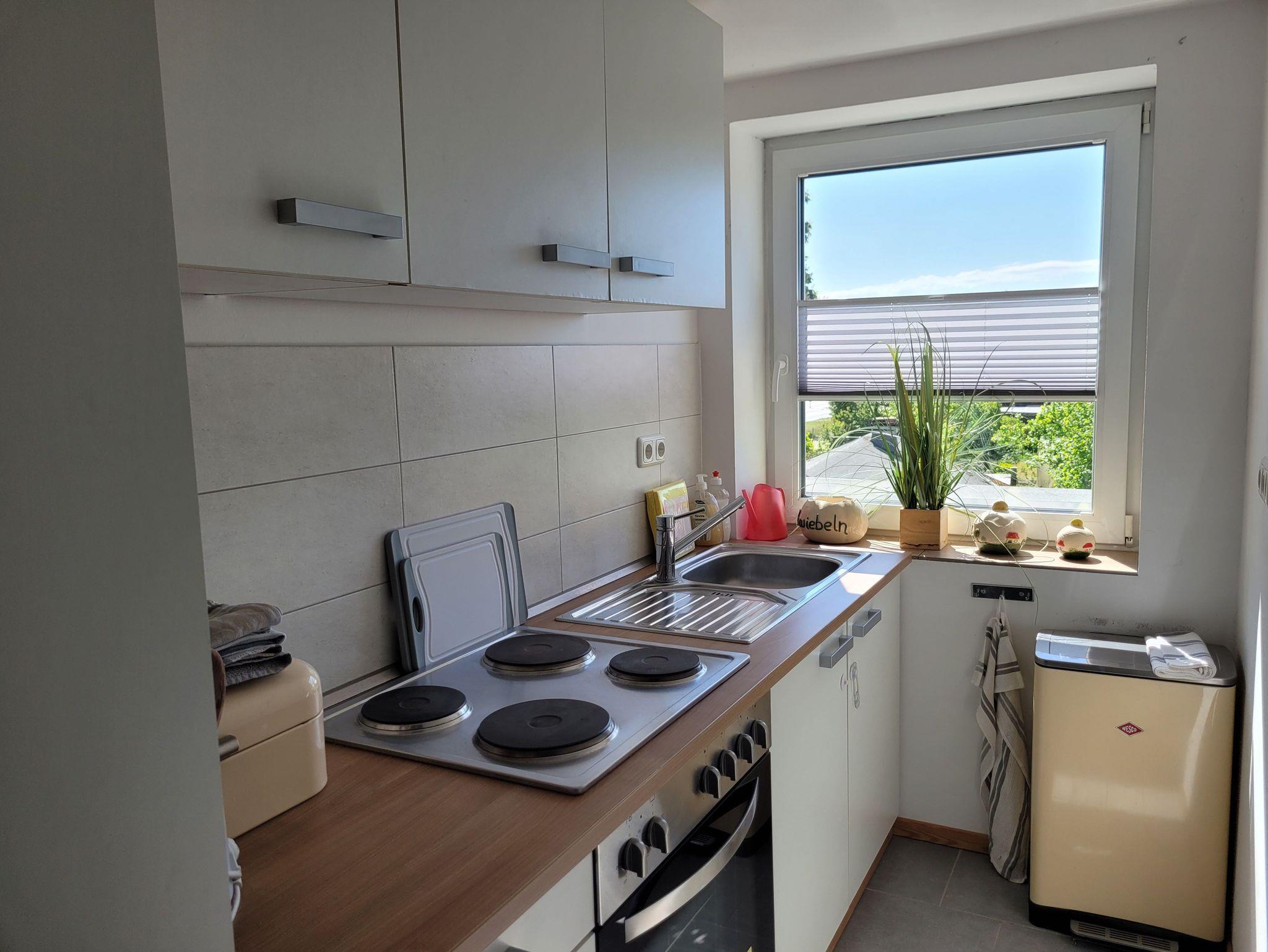 Die liebevoll eingerichtete Ferienwohnung (2020 renoviert) ist ca. 60 qm groß und dominiert durch den hellen, freundlichen Wohnbereich mit Essecke, Flachbild-TV und Zugang zur Dachterrasse. Das Schlafsofa (1,60 x 2,00m) lässt sich für eine weitere Person aufbetten. Das Schlafzimmer verfügt über einen Kleiderschrank, eine Komode sowie einen weiteren Flachbild-TV. Die offene Küche ist gut ausgestattet (Wasserkocher, Toaster, Herd, Mikrowelle, Kaffeemaschine), das Bad mit Tageslicht verfügt über eine ebenerdige Dusche und WC. Küche und Bad sind gefliest, Schlaf- und Wohnbereich mit Laminat eingerichtet. Bettwäsche und Handtücher sind in Erstausstattung im Preis inklusive. Es handelt sich um eine Nichtraucherwohnung. Vor dem Eingangsbereich bzw. auf der Dachterrasse darf geraucht werden. Haustiere sind nicht erlaubt.