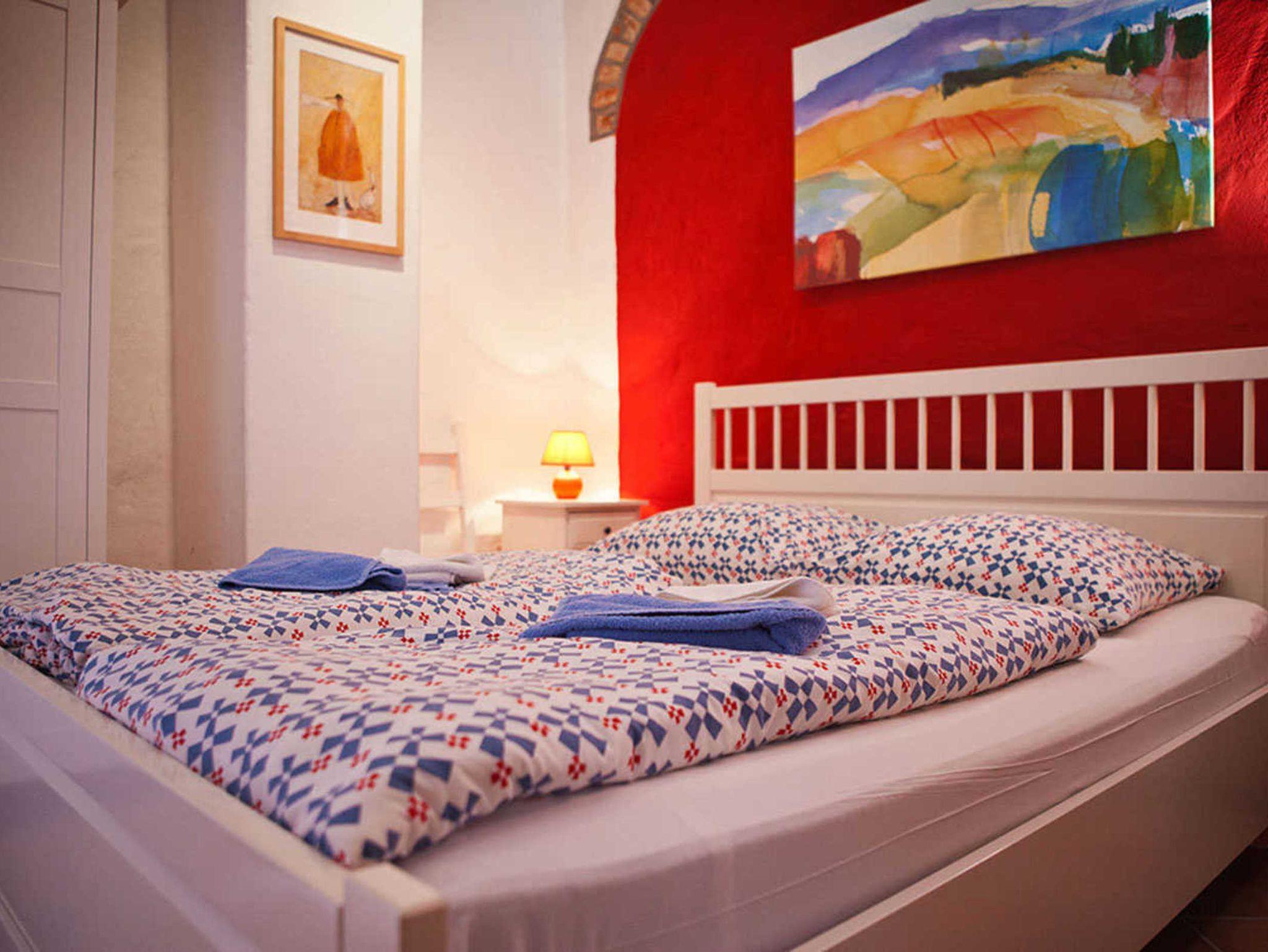 Schlafzimmer mit Doppelbett (160 x 200) mit Bettwäsche