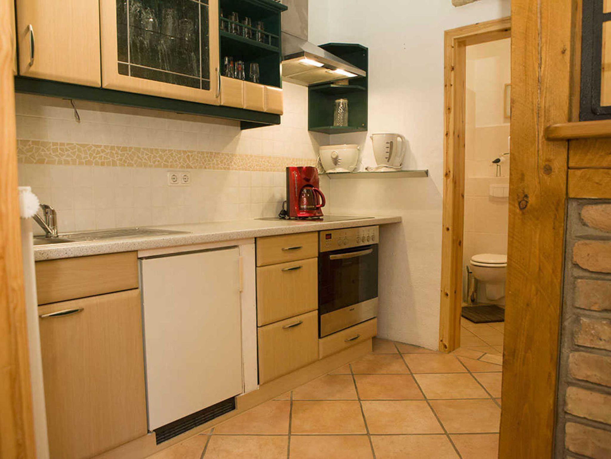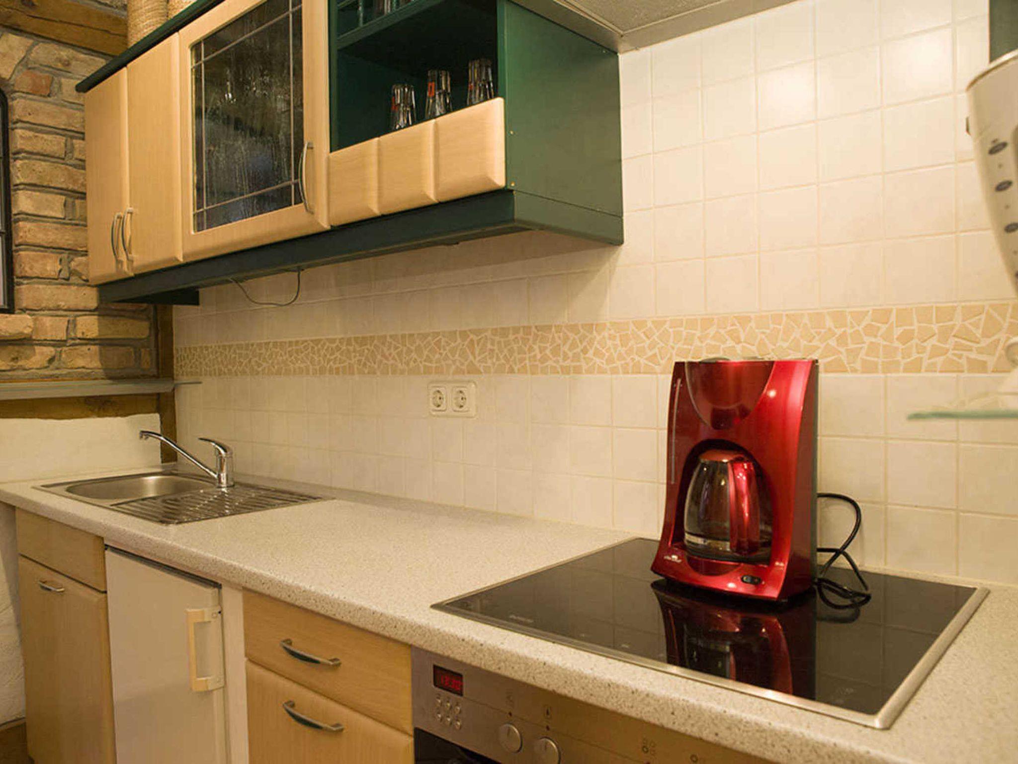 Küche mit EBK, Kühlschrank, E-Herd mit Ceranfeld und Backofen, Kaffeemaschine, Wasserkocher, Toaster, Geschirr, Besteck