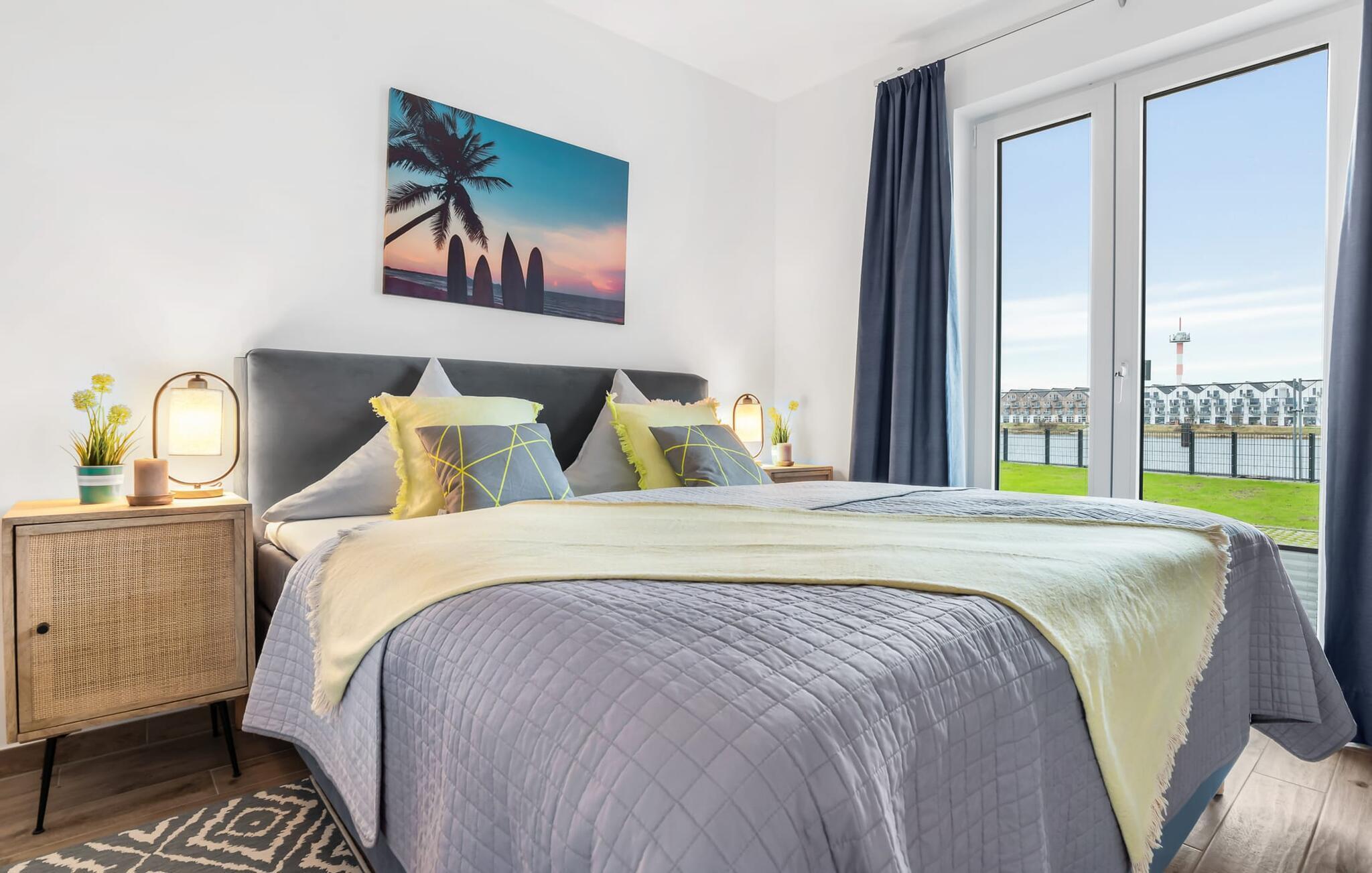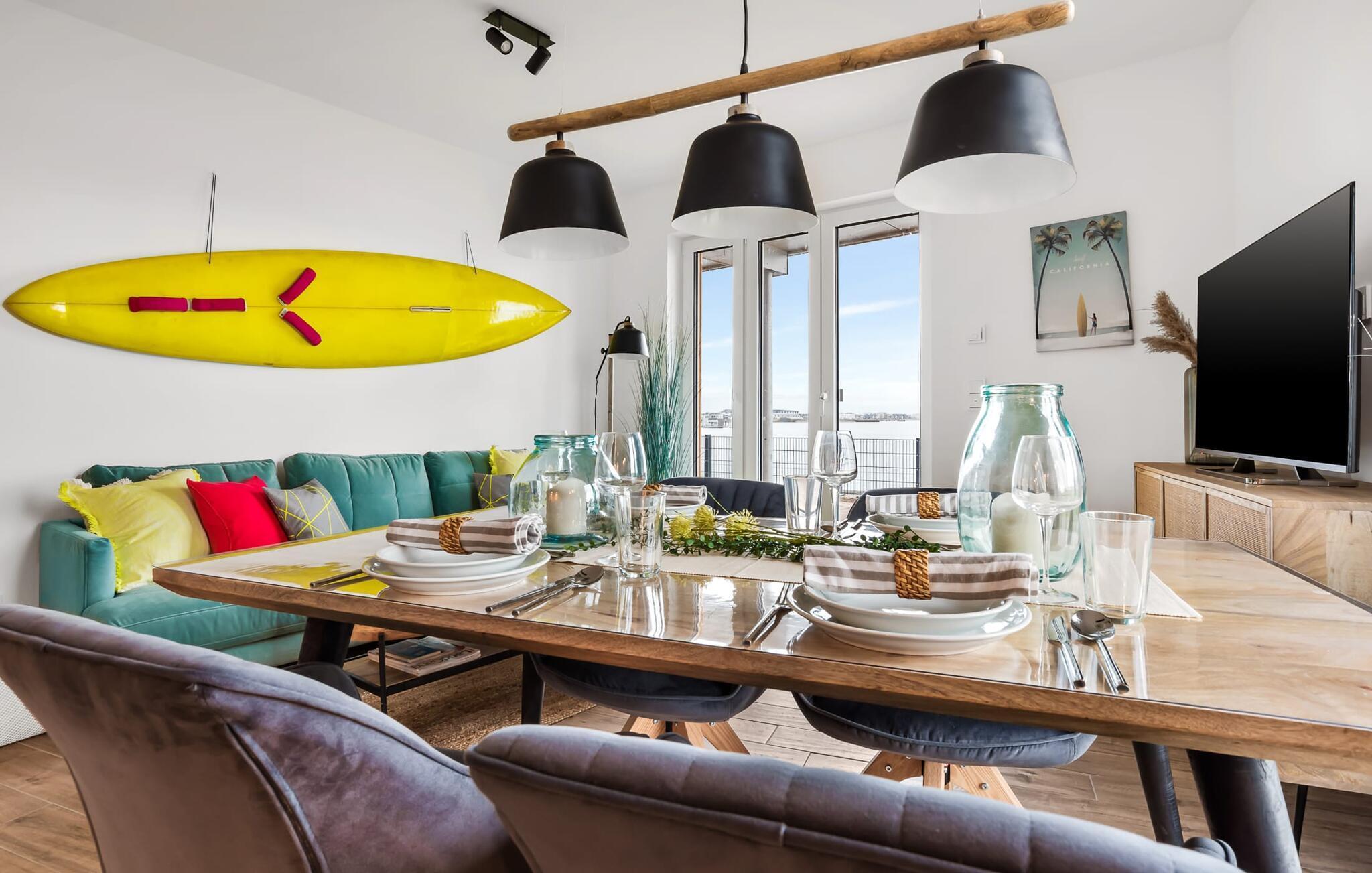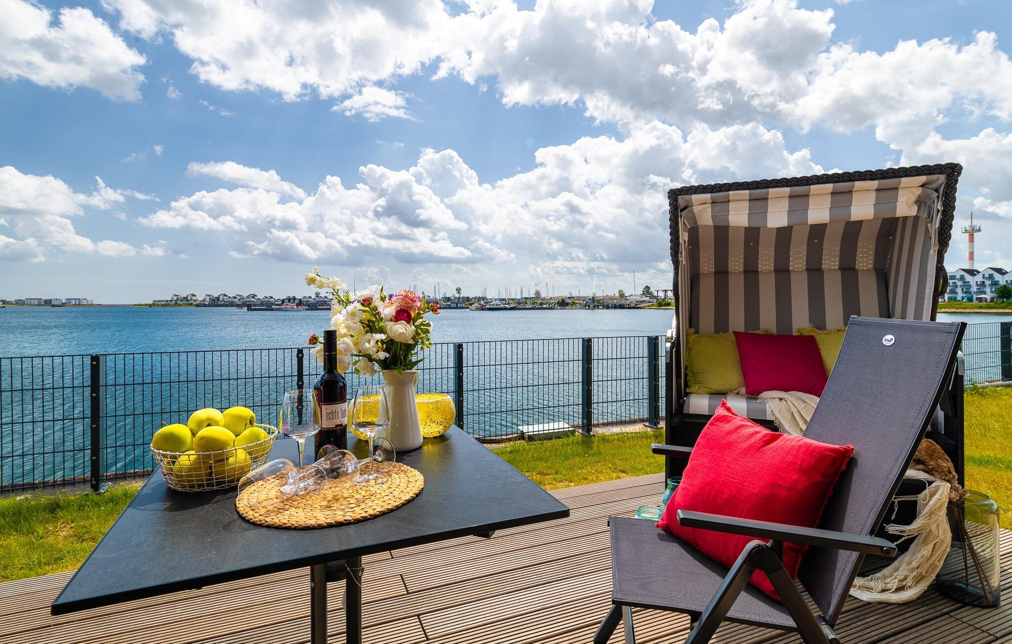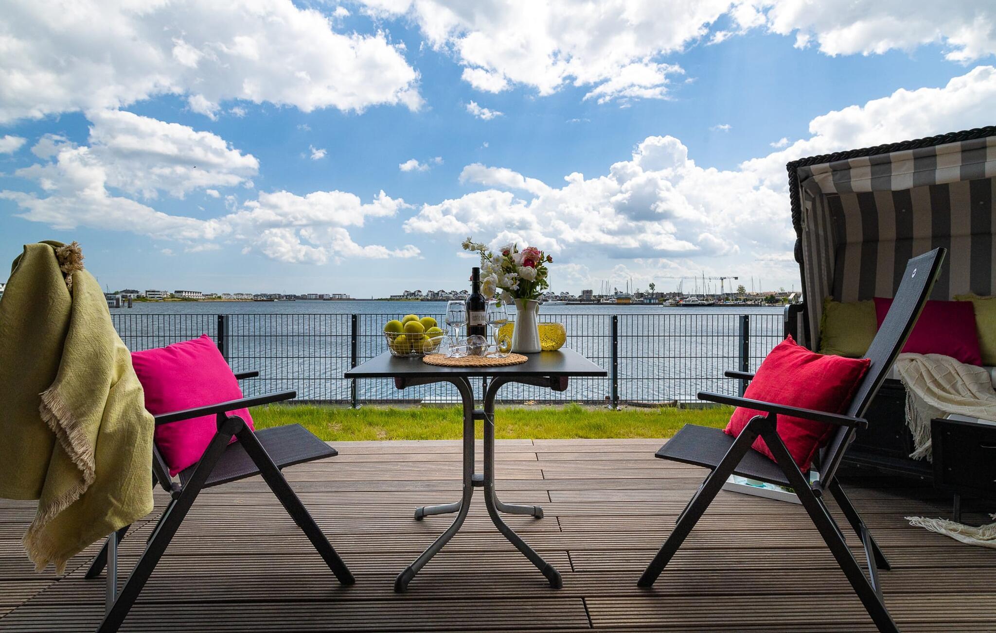 Der offene Wohn- und Essbereich mit integrierter Küche gestaltet sich aufgrund der bodentiefen Fensterfront lichtdurchflutet und die täglichen Sonnenaufgänge zu beobachten wird zu unvergesslichen Ferienerlebnissen. Von hier hat der Gast Zugang zur großen Terrasse. Der Blick auf Hafen, Wasser und Schiffe und die ferne Ostsee vermittelt das Gefühl für eine Weile Kapitän auf großer Fahrt zu sein. Die Terrasse erstreckt sich in verjüngender Form um die gesamte Wohnung und verstärkt das Gefühl an Deck zu sein. Stylische Outdoormöbel stehen bereit, um in dieser einmaligen Atmosphäre genussvoll zu dinieren oder einfach nur zu entspannen.