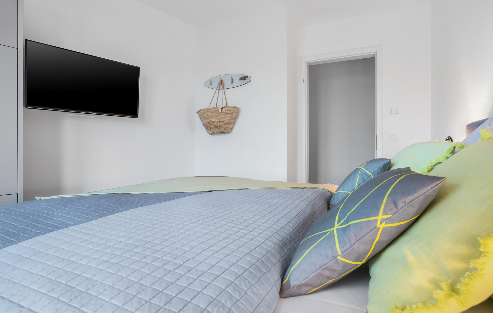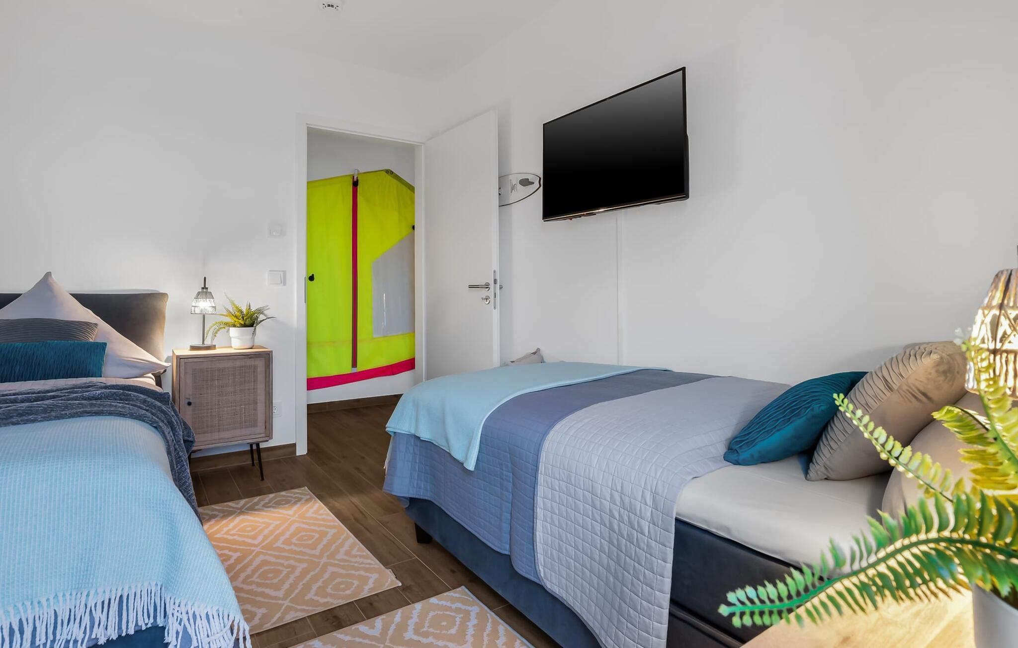Im Wohnbereich dominiert die bequeme Wohnlandschaft mit Fernseher und Kaminofen, dem es gelingt, selbst Schmuddeltage in Kuscheltage zu verwandeln. Die Einrichtung der SURFERS LOUNGE ist nordisch gemütlich und wird mit frischen BoHo Akzenten unterstrichen.