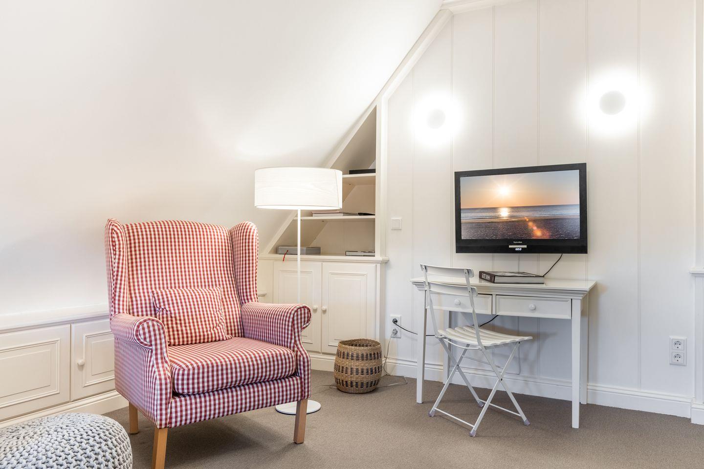 Die Ferienwohnung im Obergeschoß und ausgebautem Dachgeschoß in Südwestlage ist ca. 80 m² groß und bietet zwei bis vier Personen Geborgenheit. Das reetgedeckte Haus liegt vor dem "Süderhof" im Südwesten des Ortes auf einem rund 2000 Quadratmeter großen Grundstück, das von einem Friesenwall umgeben ist. Der Bereich im Obergeschoß ist komplett mit allergikerfreundlichem Boden versehen. Die Wohnung verfügt über modernen Komfort wie Flat-TV mit Digitalempfang, DVD und VCR, W-Lan, Stereoanlage mit CD-Spielern, Espressomaschine, Geschirrspüler, Cerankochfeld, Backofen und Mikrowelle. Im Keller des Hauses steht Ihnen gegen Gebühr eine Waschmaschine und Trockner zur Verfügung. Zur Wohnung gehört ein kleiner Platz mit einem Saison-Strandkorb (ca. April - Oktober )