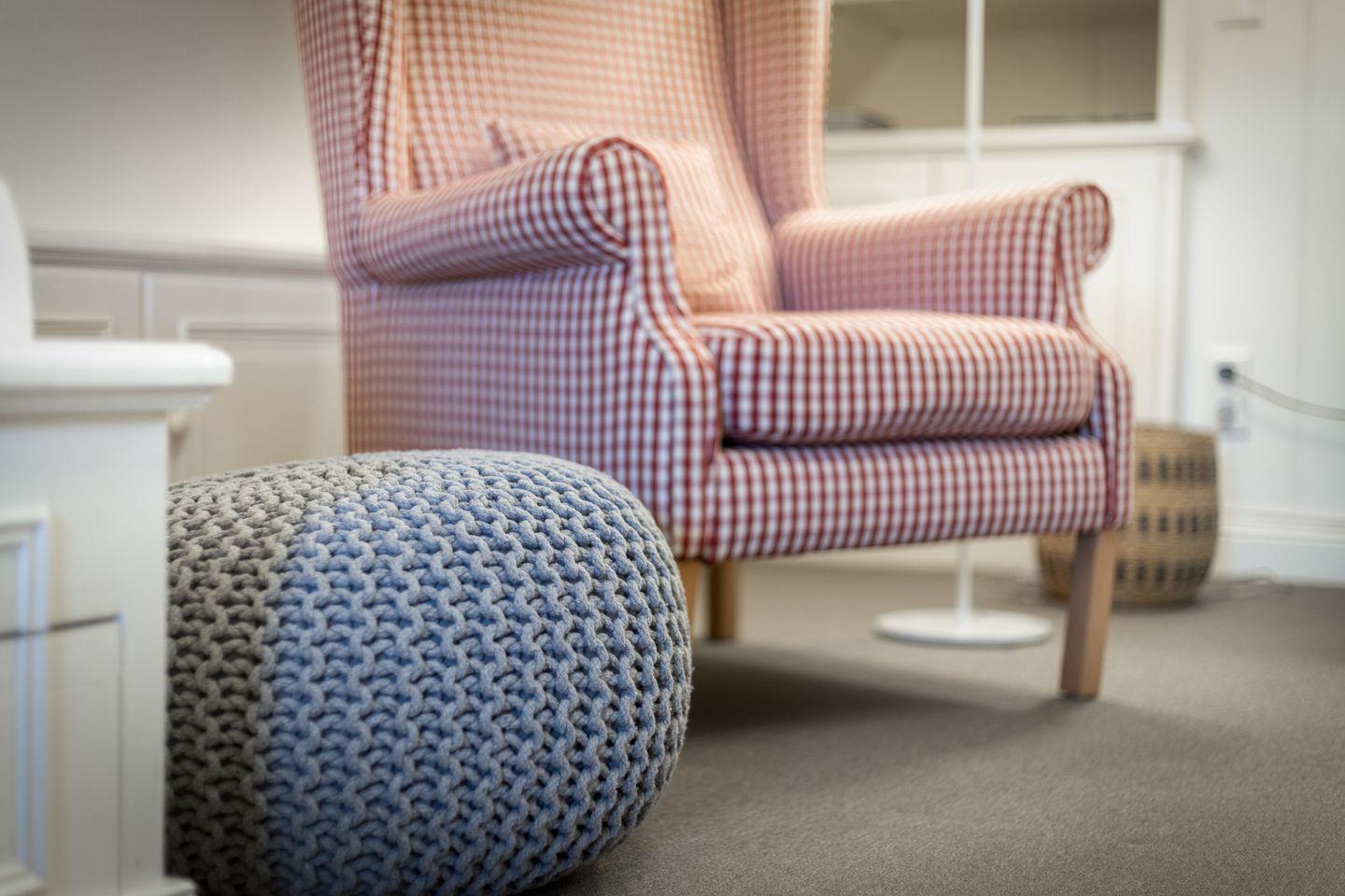 Flur 2: aus dem Vorflur geht eine offene Treppe in einen zweiten Flur mit Einbauten und Sessel