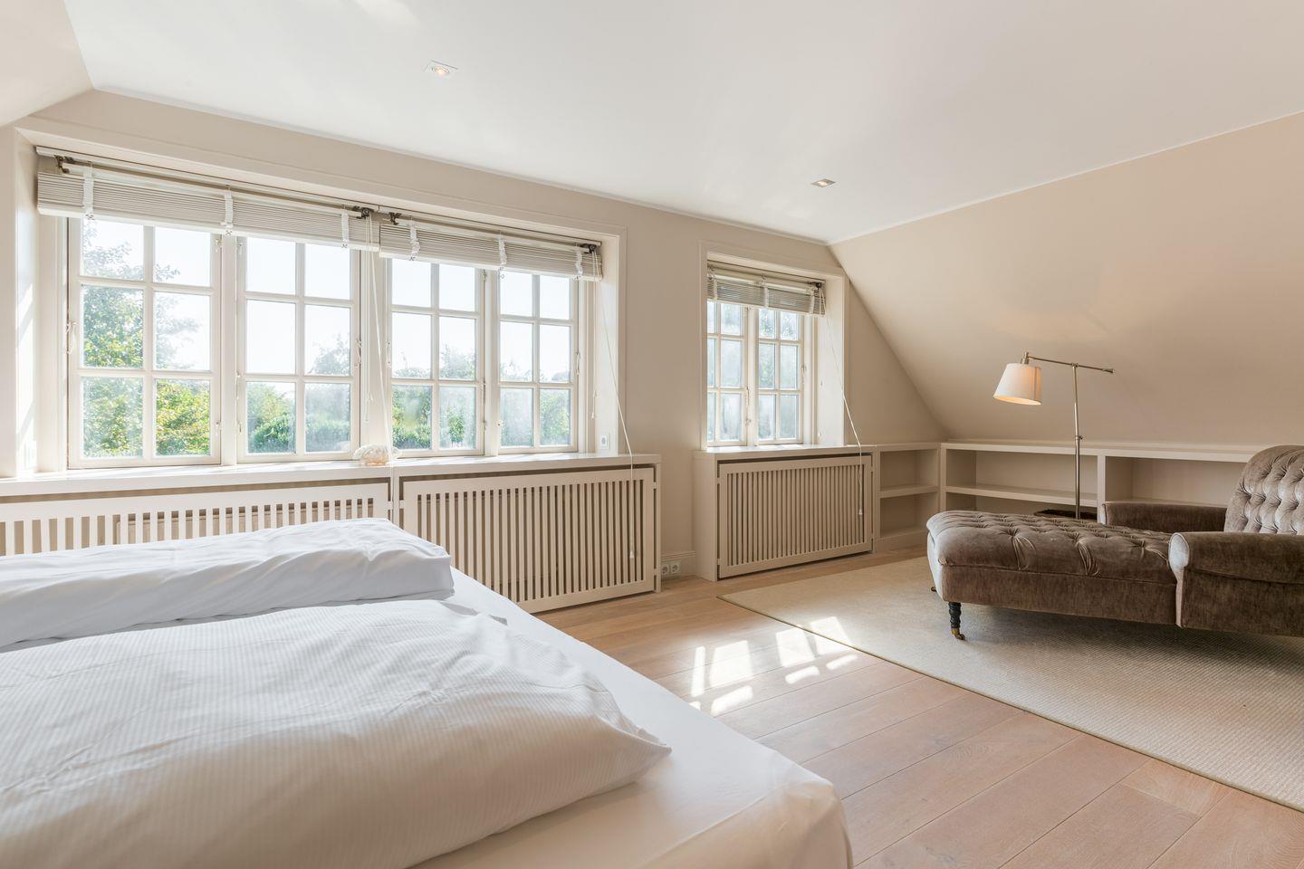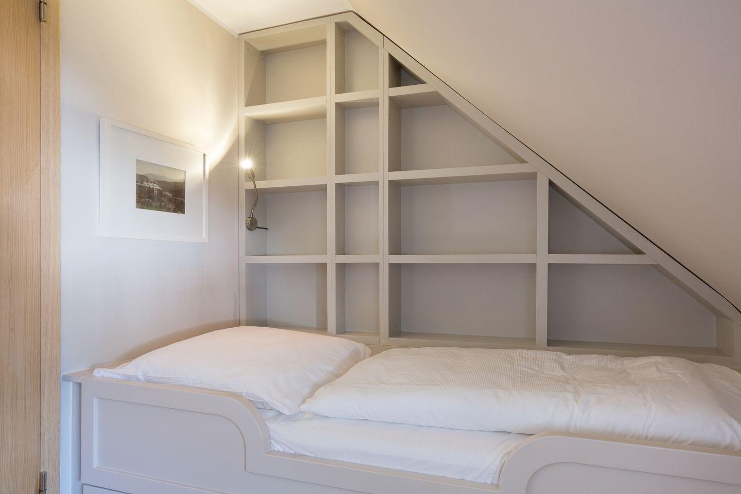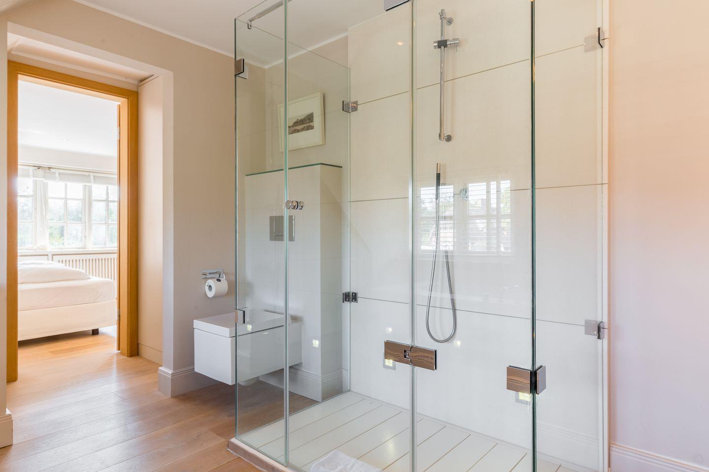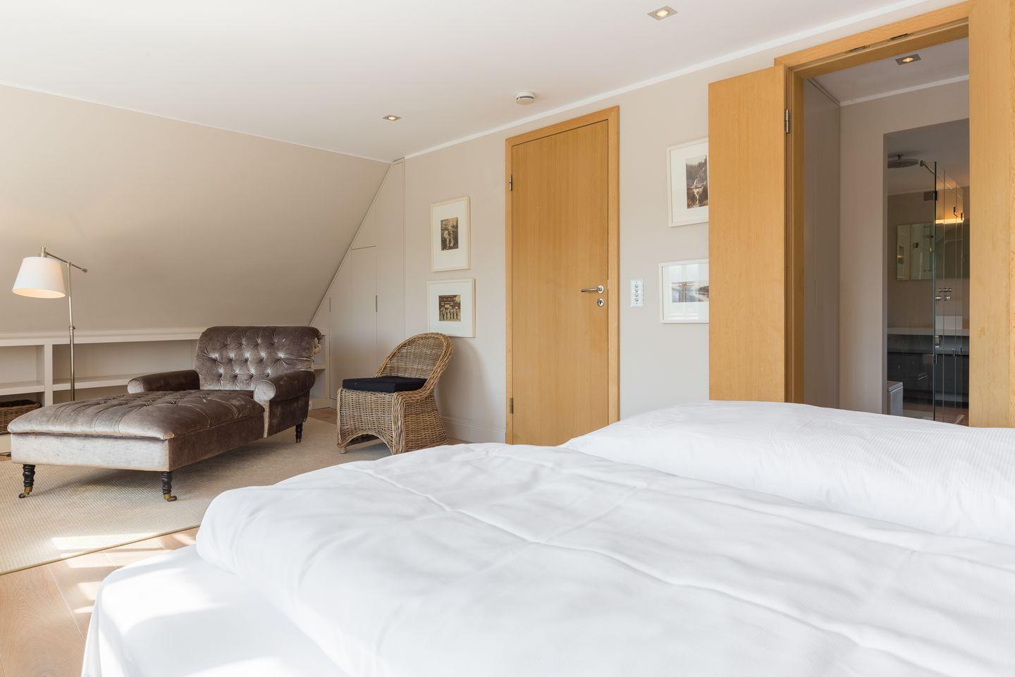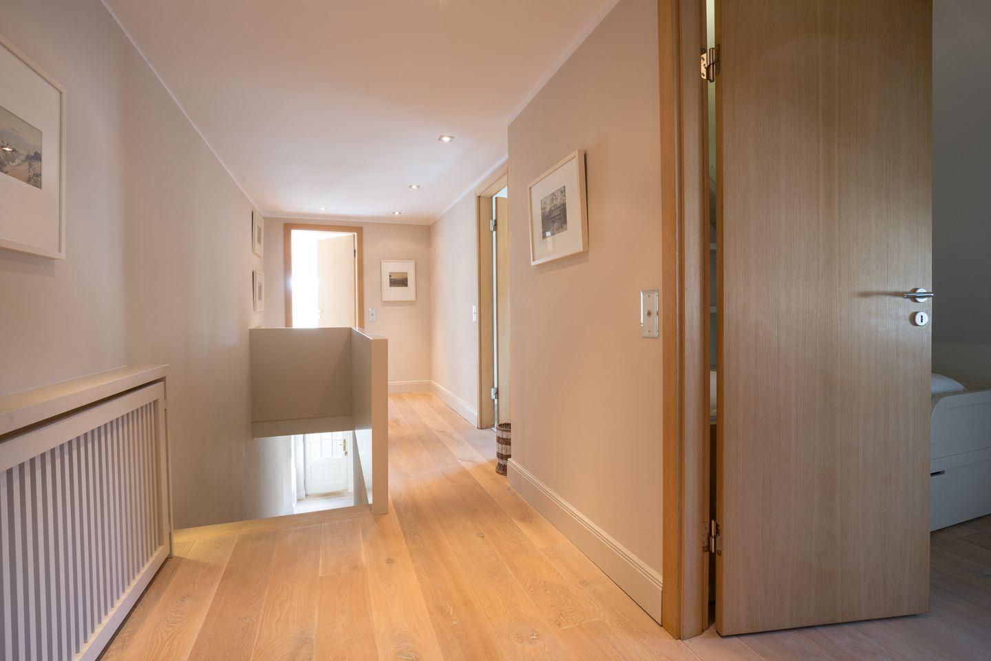 Im Obergeschoss erwartet Sie Ihre stilvolle und großzügige Schlafwelt: Sehr schöner, großer und lichtdurchfluteter Masterbedroom mit reichlich Schrankplatz. Für Ihren wohligen Schlaf sorgt das Designbett mit bester Schlafarchitektur von der Schlafspezialistenfirma Schramm (ca. 2x2 m). Ensuite Bade-Welt mit Wanne, großer Dusche, WC und Design-Doppelwaschtischen. Ebenfalls finden Sie im Obergeschoss einen Kids-Room mit Kindermobiliar und kuschelig eingebauter Liegewiese (ca. 1,8x2 m). Ein weiterer, hübsch dekorierter Schlafraum bietet zwei Personen Platz in einem komfortablen Doppelbett (ca. 1,8x2 m). Ein Einzelzimmer steht Ihnen ebenfalls noch zur Verfügung, mit hübsch eingebautem Bett und Ablageflächen, ebenso, wie ein weiteres Bad mit großer Dusche, WC und Doppelwaschtisch.