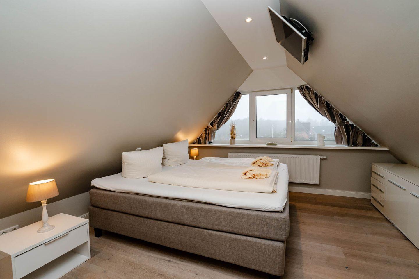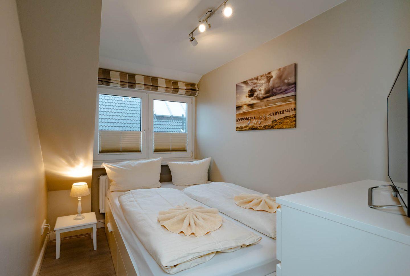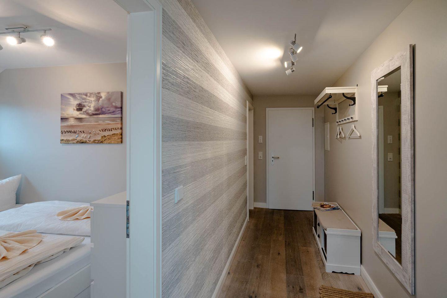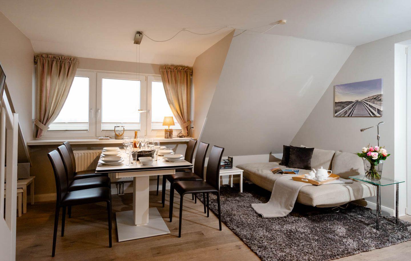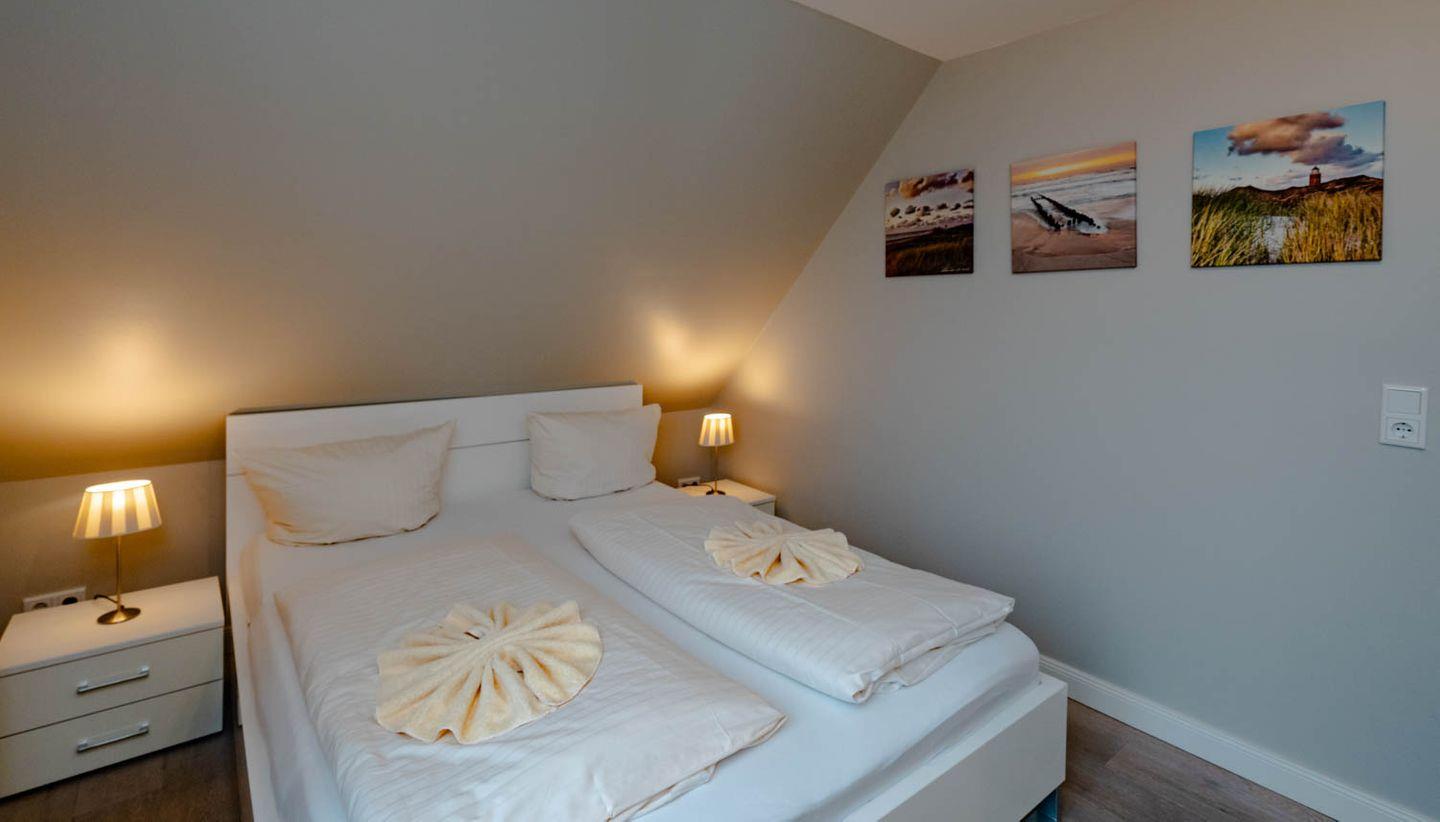 Moin, moin, willkommen im großzügigen Ferien-Appartement "Buhne 73", das Platz und allen Komfort für bis zu 6 Personen bietet und am allersüdlichsten Ende von Wenningstedt zu Hause ist. Das heißt natürlich genaugenommen, dass diese 4-Zimmer-Ferienwohnung ganz in der Nähe des kleinen beschaulichen Nordwäldchens liegt, das Wenningstedt und Westerland trennt, die Inselmetropole und der Strand also auch nicht weit entfernt sind. Die Wohnung liegt im Obergeschoss und Dachgeschoss eines vor Kurzem erbauten 5-Parteien-Hauses, ist nach Westen ausgerichtet und hat sogar einen eigenen Balkon mit attraktiver Brüstung aus Glas. Überhaupt liegt dieses Haus nicht nur sehr schön etwas abseits mit Blick auf Pferdewiese und Wäldchen, sondern ist auch noch besonders eingerichtet: sehr klar, hell, luftig und ohne überflüssigen Firlefanz, kurz gesagt – inselfrisch und wirklich schön. Drei Doppelbetten, eine vollausgestattete Küche, die kommunikativ in den Wohnbereich integriert ist, ein Bad und ein Extra-WC mit Waschbecken sowie eine Waschmaschine inklusive Trockner und ein eigener Parkplatz machen "Buhne 73" zu einem perfekten Partner für Ihre Ferien. Woher der Name kommt? Buhnen, das waren die alten und wie sich heute zeigt unnützen Wellenbrecher aus Beton oder Holz, die jetzt an der Westküste entfernt werden und die 73 verdankt die Wohnung schlicht ihrer Hausnummer.