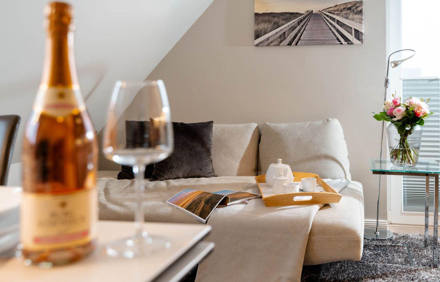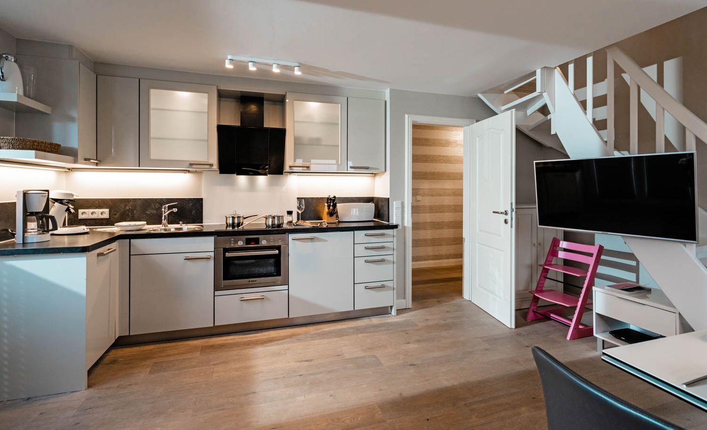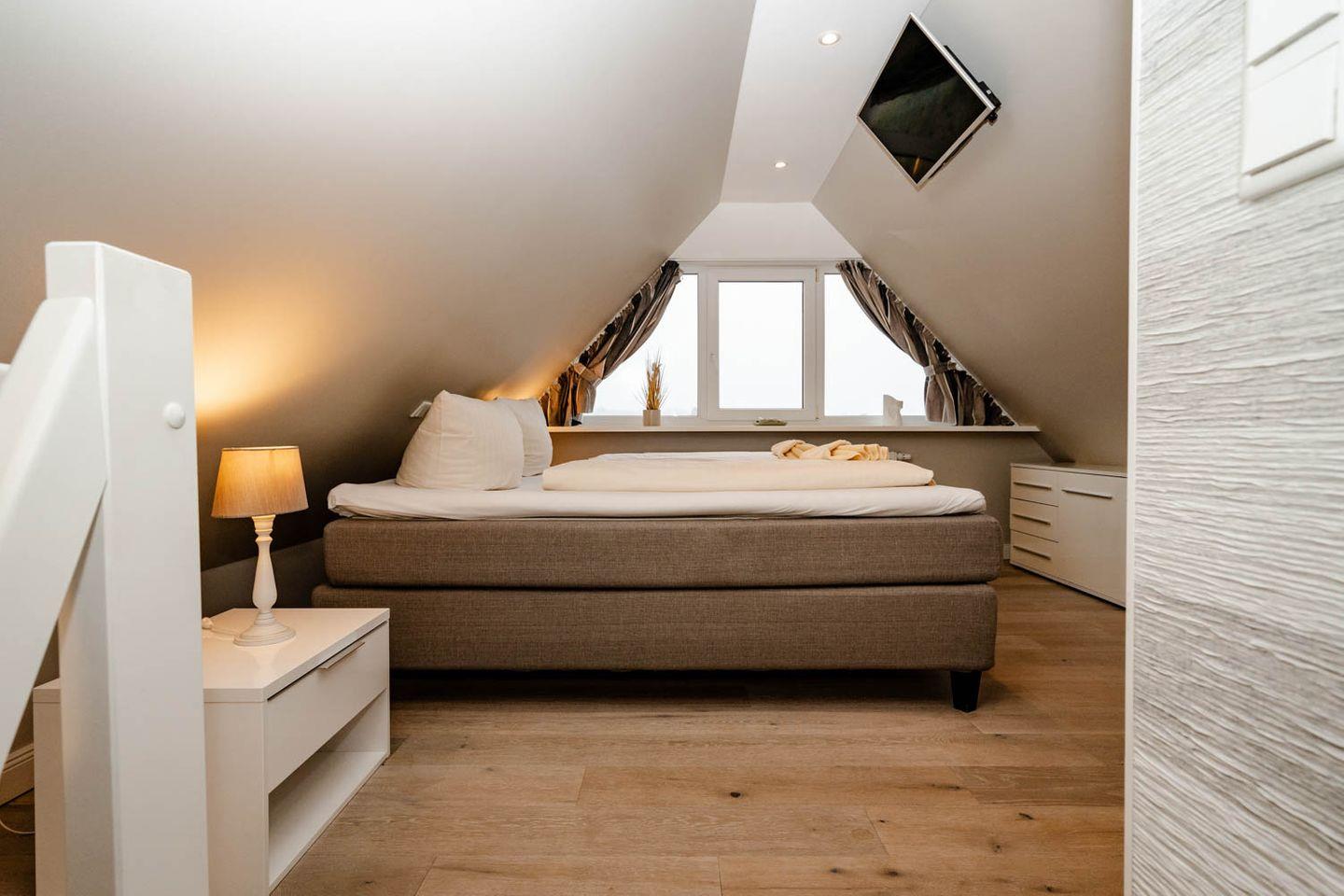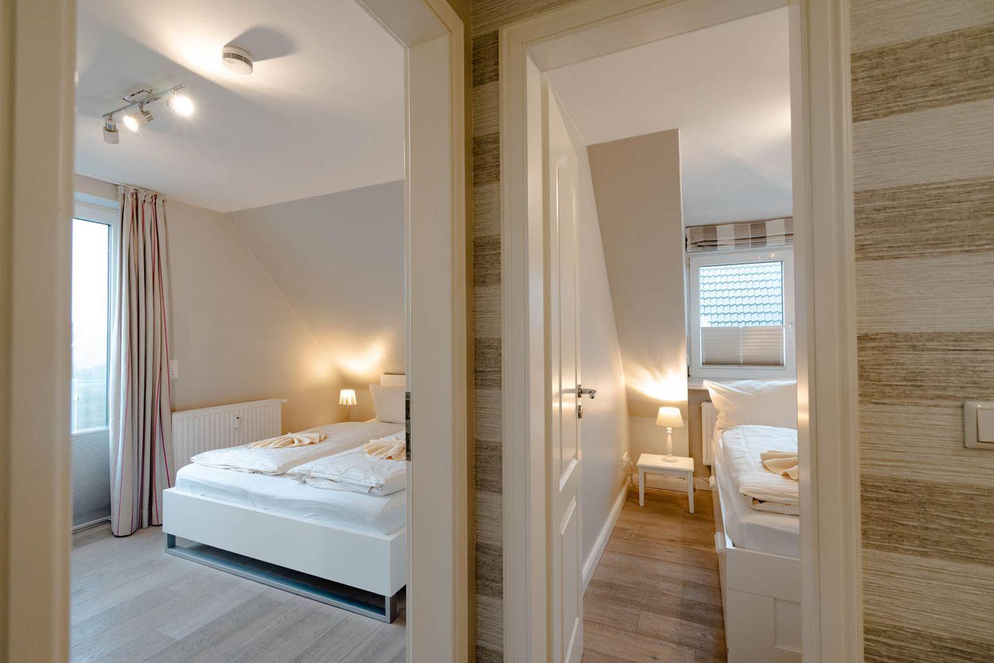 Moin, moin, willkommen im großzügigen Ferien-Appartement "Buhne 73", das Platz und allen Komfort für bis zu 6 Personen bietet und am allersüdlichsten Ende von Wenningstedt zu Hause ist. Das heißt natürlich genaugenommen, dass diese 4-Zimmer-Ferienwohnung ganz in der Nähe des kleinen beschaulichen Nordwäldchens liegt, das Wenningstedt und Westerland trennt, die Inselmetropole und der Strand also auch nicht weit entfernt sind. Die Wohnung liegt im Obergeschoss und Dachgeschoss eines vor Kurzem erbauten 5-Parteien-Hauses, ist nach Westen ausgerichtet und hat sogar einen eigenen Balkon mit attraktiver Brüstung aus Glas. Überhaupt liegt dieses Haus nicht nur sehr schön etwas abseits mit Blick auf Pferdewiese und Wäldchen, sondern ist auch noch besonders eingerichtet: sehr klar, hell, luftig und ohne überflüssigen Firlefanz, kurz gesagt – inselfrisch und wirklich schön. Drei Doppelbetten, eine vollausgestattete Küche, die kommunikativ in den Wohnbereich integriert ist, ein Bad und ein Extra-WC mit Waschbecken sowie eine Waschmaschine inklusive Trockner und ein eigener Parkplatz machen "Buhne 73" zu einem perfekten Partner für Ihre Ferien. Woher der Name kommt? Buhnen, das waren die alten und wie sich heute zeigt unnützen Wellenbrecher aus Beton oder Holz, die jetzt an der Westküste entfernt werden und die 73 verdankt die Wohnung schlicht ihrer Hausnummer.