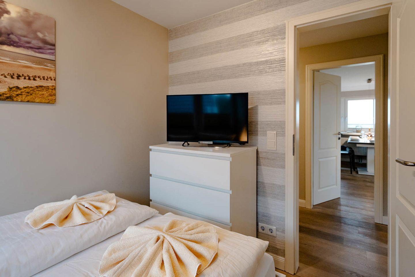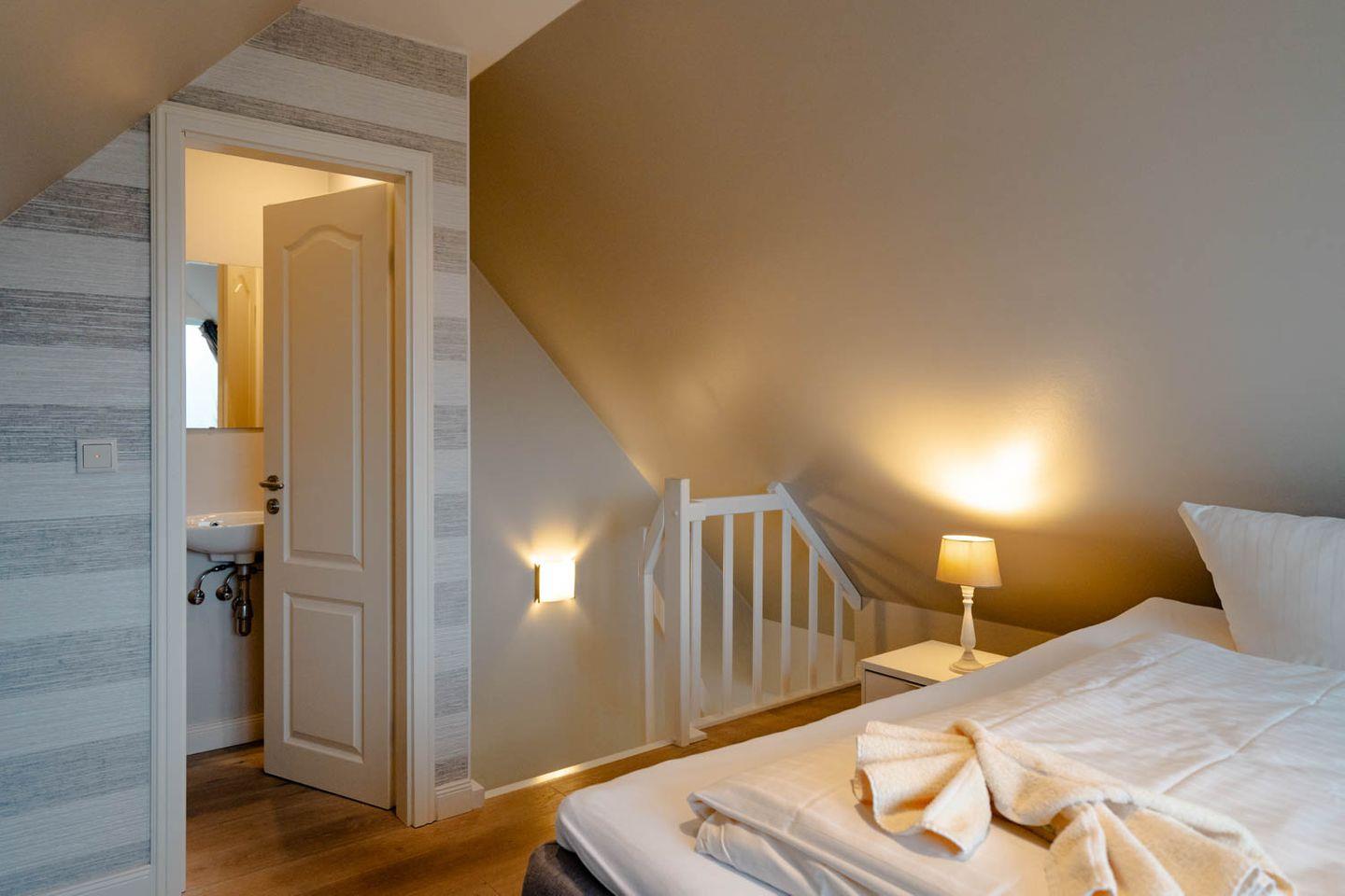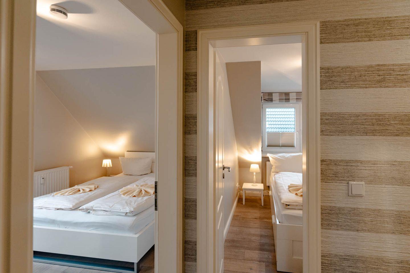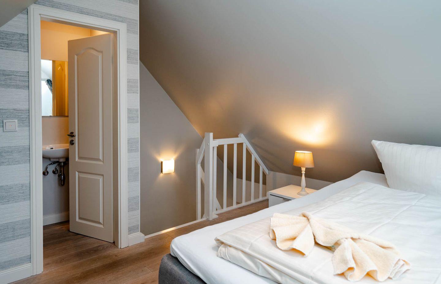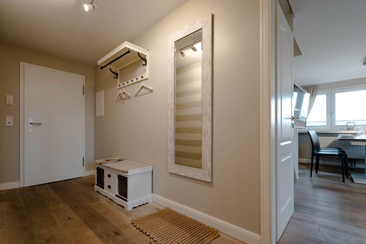 Moin, moin, willkommen im großzügigen Ferien-Appartement "Buhne 73", das Platz und allen Komfort für bis zu 6 Personen bietet und am allersüdlichsten Ende von Wenningstedt zu Hause ist. Das heißt natürlich genaugenommen, dass diese 4-Zimmer-Ferienwohnung ganz in der Nähe des kleinen beschaulichen Nordwäldchens liegt, das Wenningstedt und Westerland trennt, die Inselmetropole und der Strand also auch nicht weit entfernt sind. Die Wohnung liegt im Obergeschoss und Dachgeschoss eines vor Kurzem erbauten 5-Parteien-Hauses, ist nach Westen ausgerichtet und hat sogar einen eigenen Balkon mit attraktiver Brüstung aus Glas. Überhaupt liegt dieses Haus nicht nur sehr schön etwas abseits mit Blick auf Pferdewiese und Wäldchen, sondern ist auch noch besonders eingerichtet: sehr klar, hell, luftig und ohne überflüssigen Firlefanz, kurz gesagt – inselfrisch und wirklich schön. Drei Doppelbetten, eine vollausgestattete Küche, die kommunikativ in den Wohnbereich integriert ist, ein Bad und ein Extra-WC mit Waschbecken sowie eine Waschmaschine inklusive Trockner und ein eigener Parkplatz machen "Buhne 73" zu einem perfekten Partner für Ihre Ferien. Woher der Name kommt? Buhnen, das waren die alten und wie sich heute zeigt unnützen Wellenbrecher aus Beton oder Holz, die jetzt an der Westküste entfernt werden und die 73 verdankt die Wohnung schlicht ihrer Hausnummer.