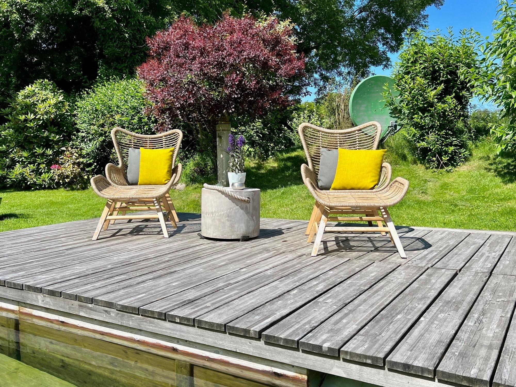 Gartenstühlen, Tisch und Strandkorb dürfen gern gemeinschaftlich genutzt werden.