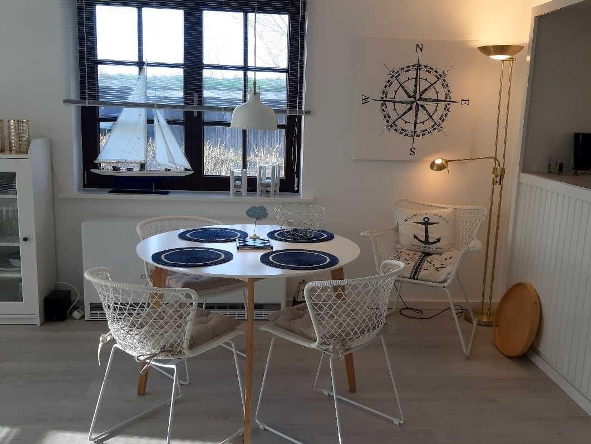 Die ganze Wohnung ist mit nordisch anmutendem Fußboden ausgelegt und nordseemäßig mit maritimen Elementen dekoriert.