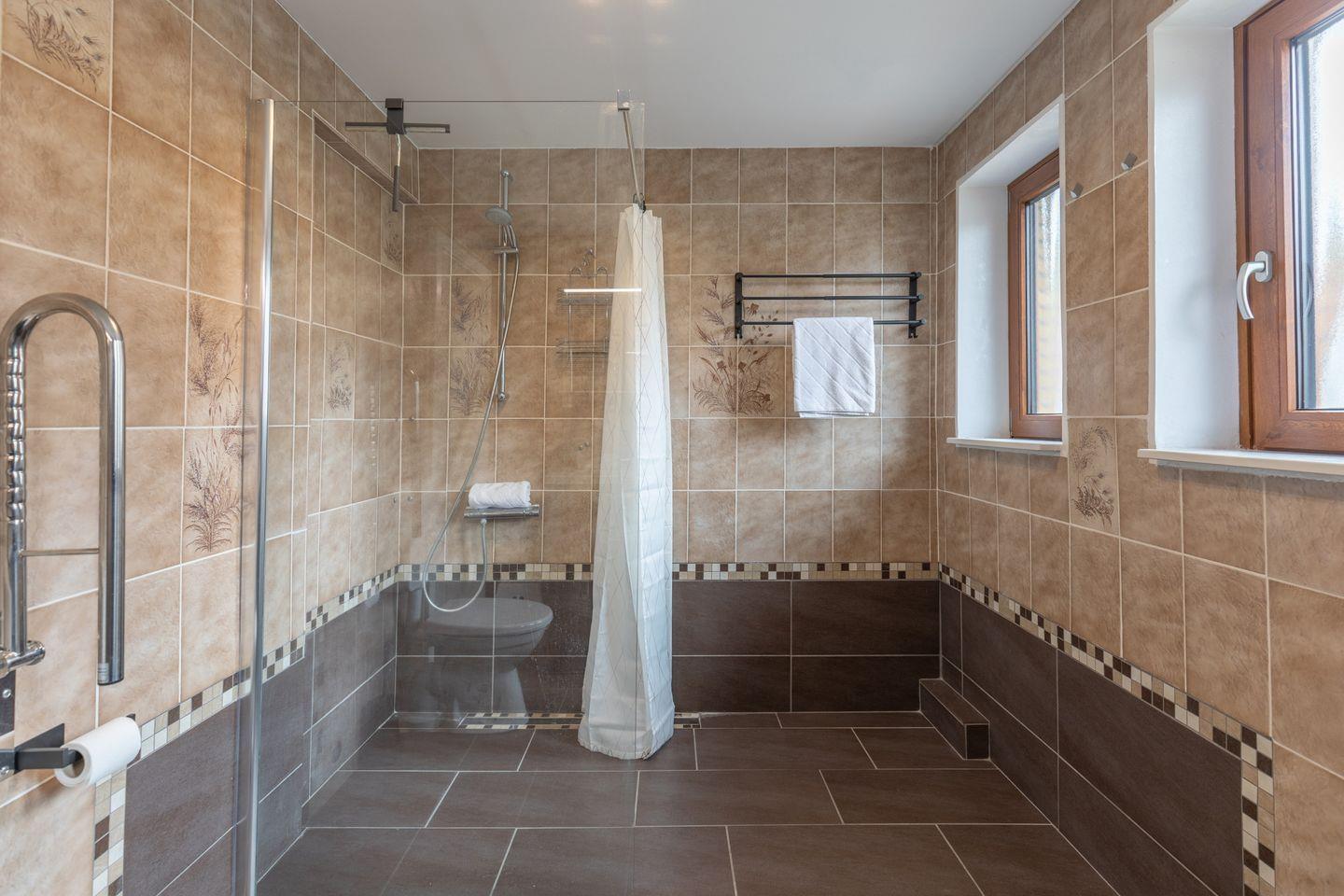 Das moderne Badezimmer ist mit einer ebenerdigen Dusche, WC und Waschbecken ausgestattet. Ein Haartrockner und Kosmetikspiegel sind ebenfalls vorhanden.