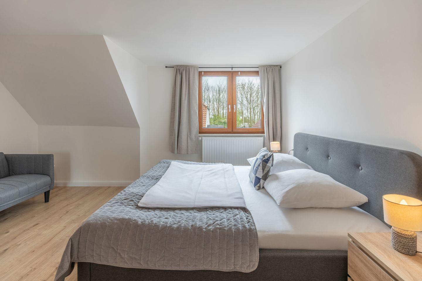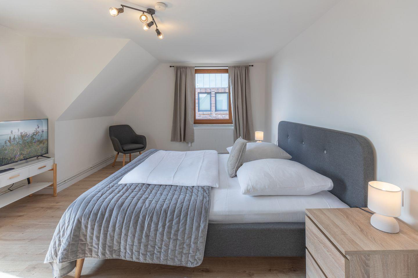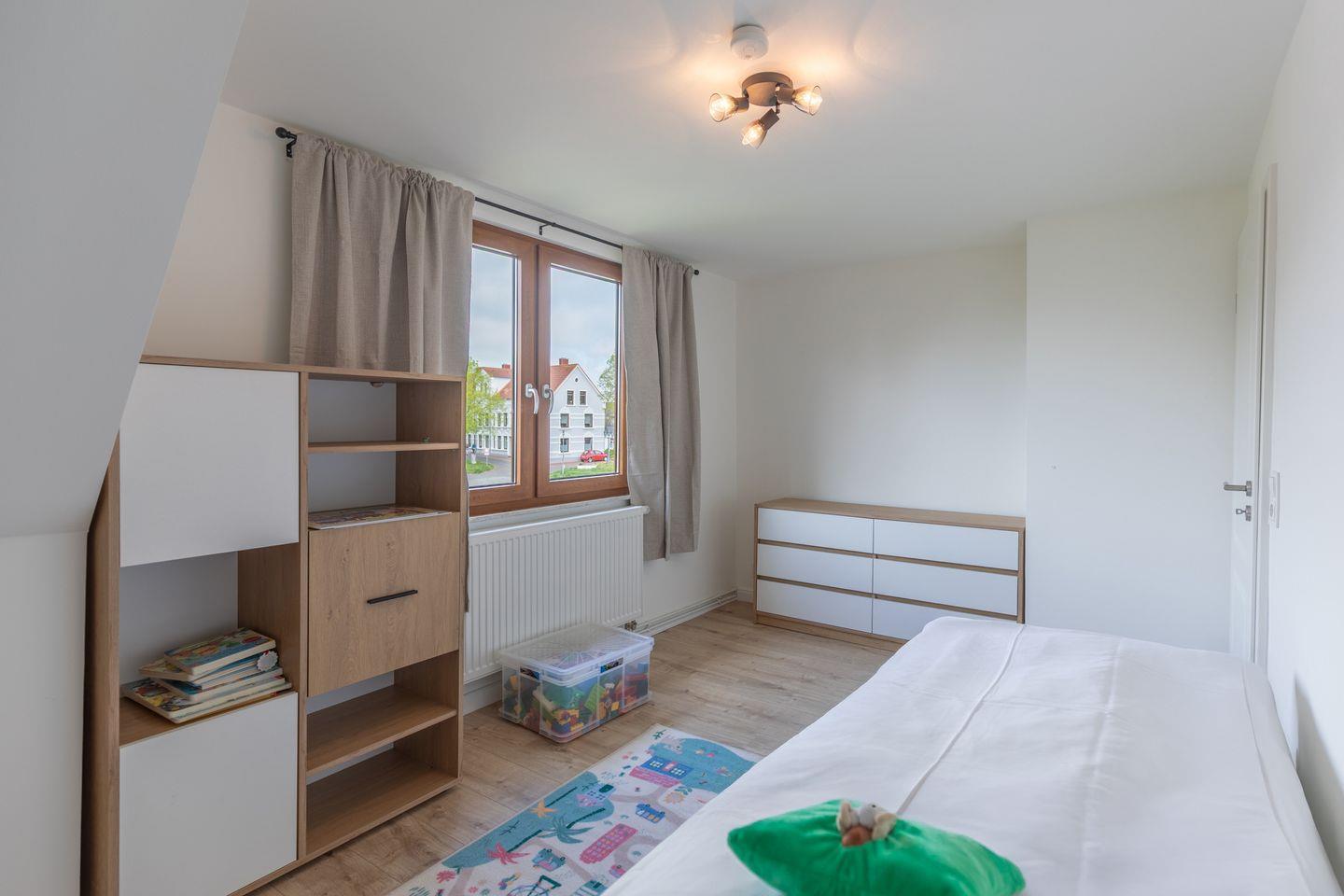 Eine Holztreppe führt Sie in das Obergeschoss, wo sich drei Schlafzimmer befinden. Zwei der Zimmer sind jeweils mit einem Doppelbett (1,80 x 2,00 m) ausgestattet, während das dritte Schlafzimmer über zwei Einzelbetten (je 90 x 2,00 m) verfügt. Zusätzlich steht Ihnen ein separater Raum als Homeoffice zur Verfügung – mit Schreibtisch und Monitor, ideal zum Arbeiten mit Blick auf den Tönninger Hafen.