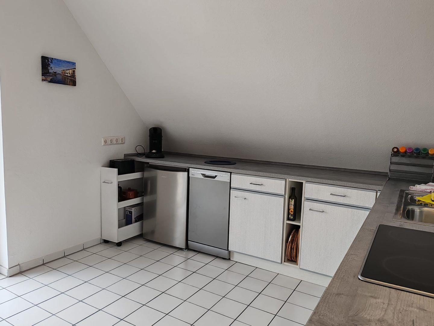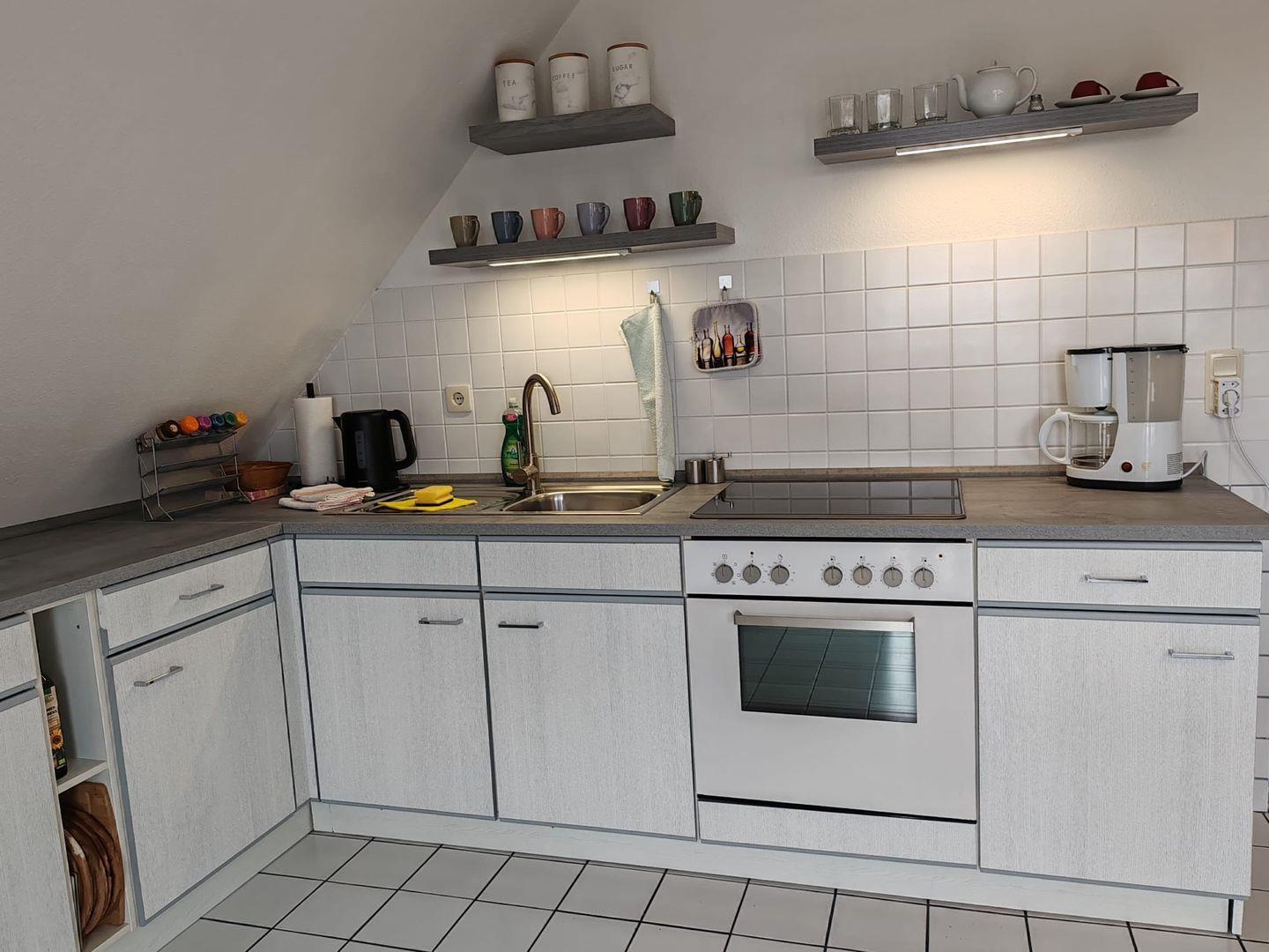 Küche: Voll ausgestattete Küche mit Mikrowelle, Cerankochfeld, Backofen, Kühlschrank mit Gefrierfach, Spülmaschine, Wasserkocher, Toaster, Elektrogrill sowie Kaffeemaschine und Kaffeepadmaschine.