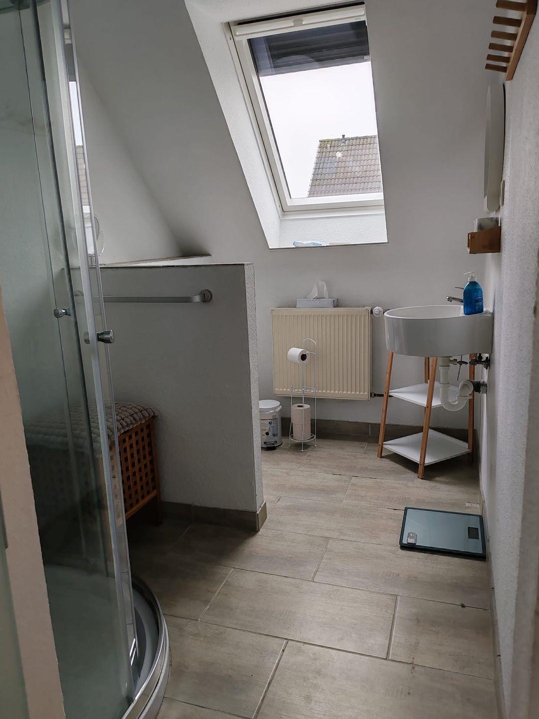 Badezimmer: Modern ausgestattet mit Dusche, WC, Waschbecken, Ganzkörperspiegel, Haartrockner und Fenster.