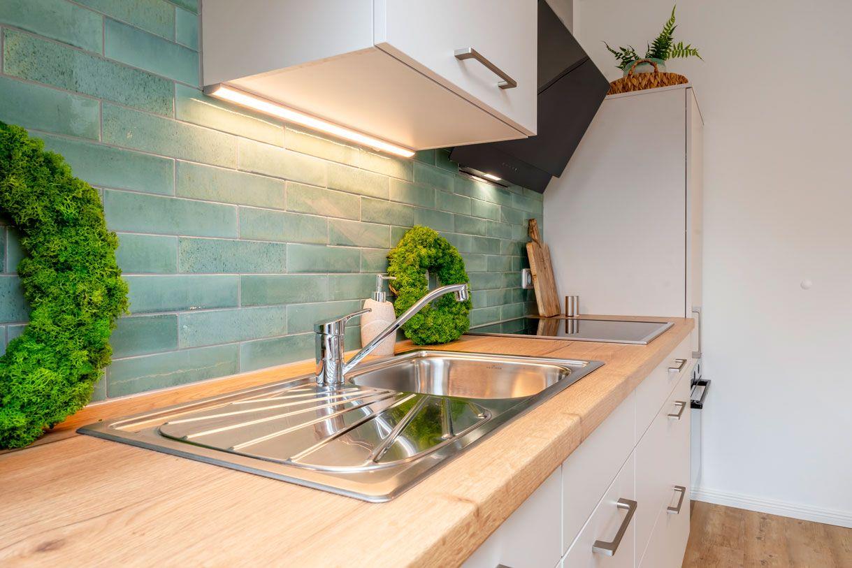Esstisch mit 4 Stühlen, voll ausgestattete Küche mit Herd und Backofen, Spülmaschine, Kühlschrank, Töpfen, Pfannen, Geschirr, Besteck, Bechern, Gläsern, Kaffeemaschine, Wasserkocher und Toaster. Das Badezimmer hat Waschbecken, WC, Dusche sowie Haartrockner.