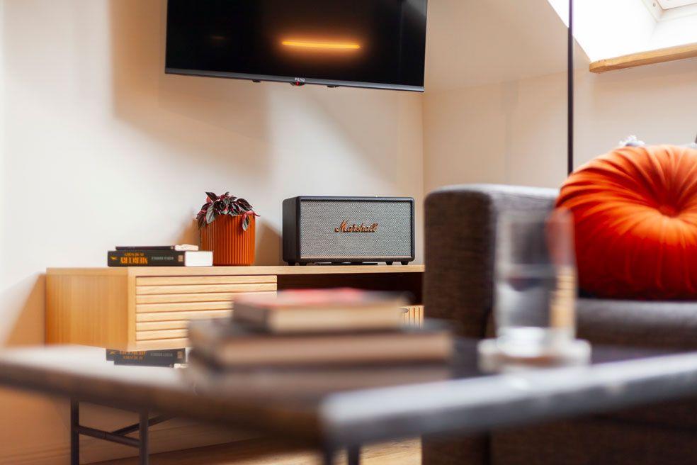 Diese einzigartige Ferienwohnung unter der gemütlichen Dachschräge lädt ein, in eine rockige Atmosphäre einzutauchen. Das stilvolle Interieur kombiniert coole Schwarztöne mit orangenen Akzenten, während eine Gitarre bereitsteht, um für musikalische Momente zu sorgen. Inspiriert vom legendären David Bowie, spiegelt die Dekoration seinen einzigartigen Stil wider. Perfekt für Musikliebhaber und Rockfans, die einen kreativen Rückzugsort suchen!