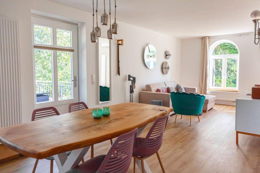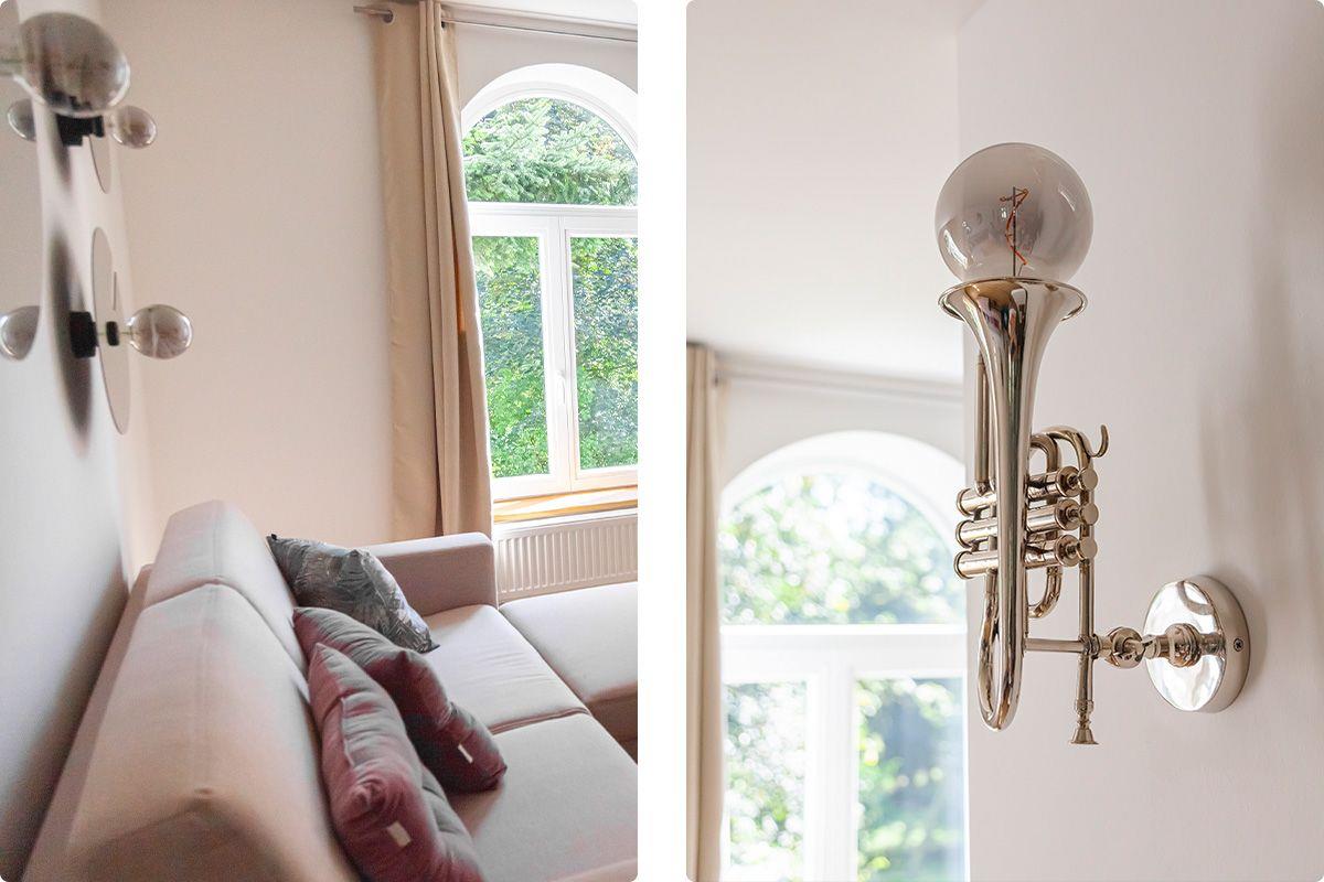 Diese Ferienwohnung versprüht den unverwechselbaren Spirit von Janis Joplin und den Sixties. Über dem rustikalen Baumkanten-Esstisch hängen stylische Pendelleuchten aus Retro-Mikrofonen, die für das perfekte Rock’n’Roll-Feeling sorgen. Ein cooler Cocktail-Sessel im Sixties-Design lädt zum Relaxen ein, während Trompeten als kreative Wandleuchten einen Hauch von Jazz und Vintage-Flair verleihen. Die gemütliche Schlafnische mit Doppelbett bietet einen behaglichen Rückzugsort nach einem Tag voller Entdeckungen. Perfekt für Musik- und Designliebhaber!