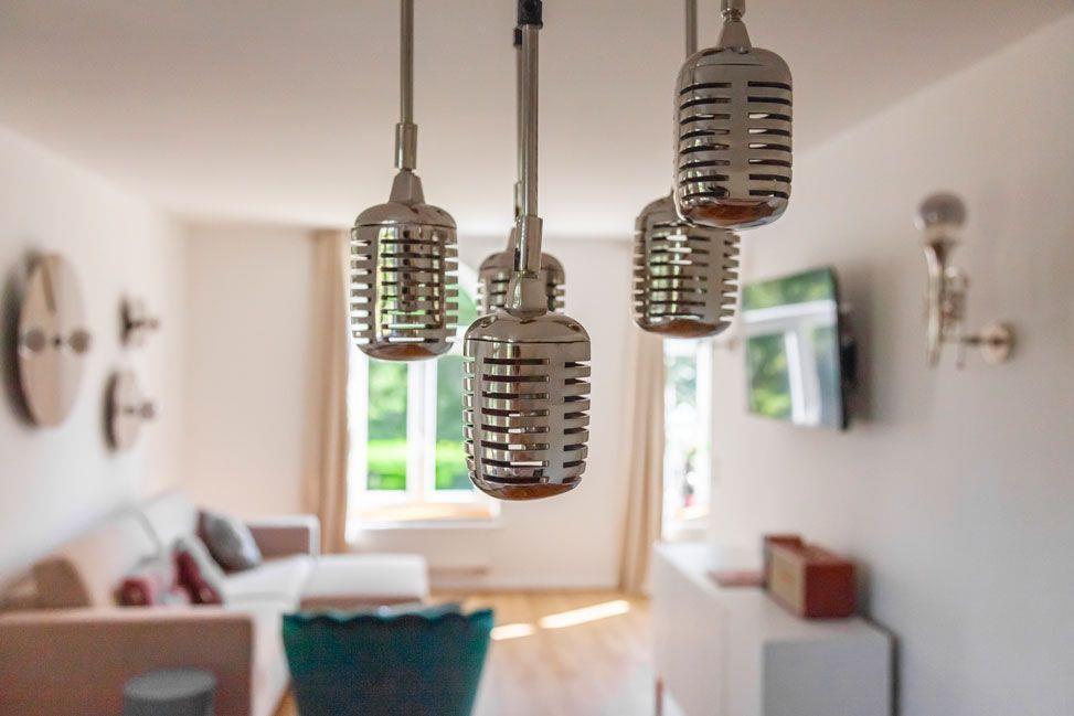 Diese Ferienwohnung versprüht den unverwechselbaren Spirit von Janis Joplin & den Sixties. Über dem rustikalen Baumkanten-Esstisch hängen stylische Pendelleuchten aus Retro-Mikrofonen, die für Rock’n’Roll-Feeling sorgen. Ein Cocktail-Sessel im Sixties-Design lädt zum Relaxen ein, während Trompeten als Wandleuchten einen Hauch von Jazz & Vintage-Flair verleihen. Die Schlafnische mit Doppelbett bietet einen Rückzugsort nach einem Tag voller Entdeckungen. Perfekt für Musik- & Designliebhaber!