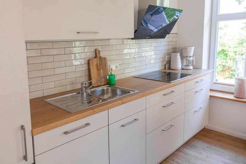 Esstisch mit 4 Stühlen, voll ausgestattete Küche mit Herd und Backofen, Spülmaschine, Kühlschrank, Töpfen, Pfannen, Geschirr, Besteck, Bechern, Gläsern, Kaffeemaschine, Wasserkocher und Toaster. Das Badezimmer hat Waschbecken, WC, Dusche sowie Haartrockner.