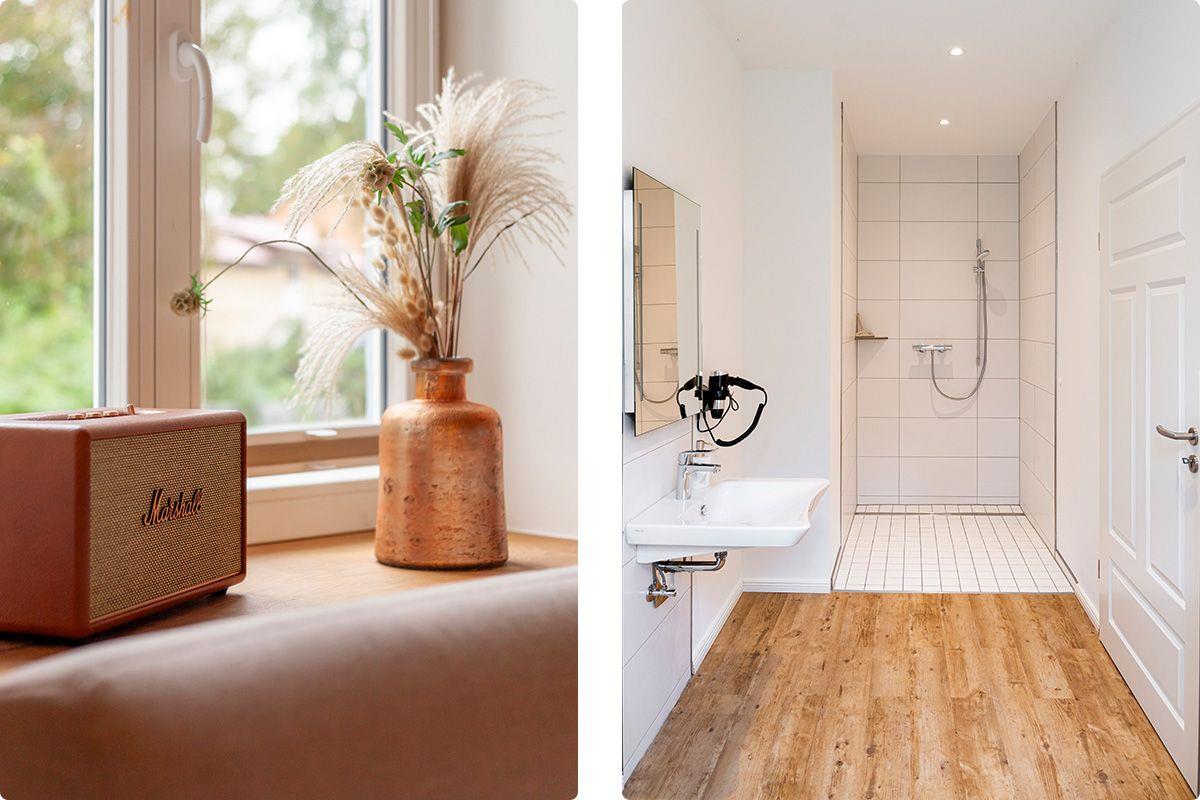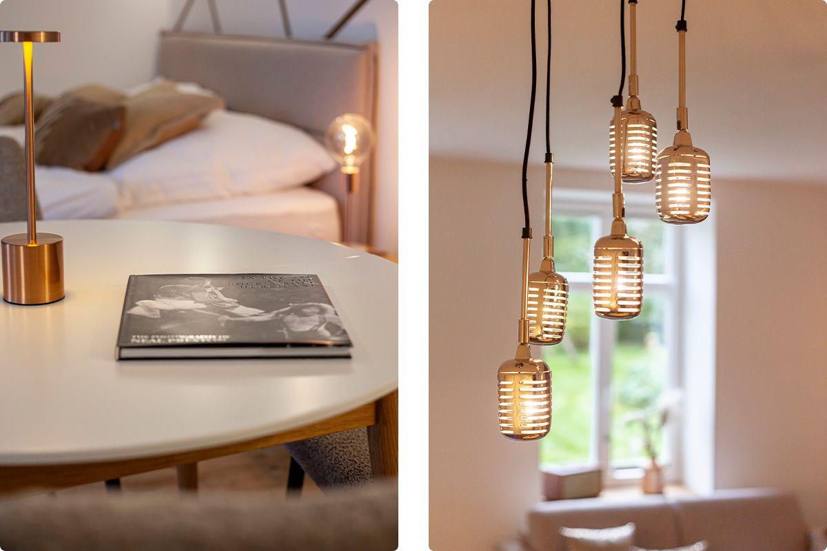 Was leuchtet denn da? Genau: Retro-Mikrofone als Pendelleuchte. Ferienwohnung „Udo“ ist zwar nicht das Hotel Atlantik, doch der Panik-Rocker ist hier in tollen Details spürbar. Als weitere Besonderheit findet ihr in dieser Wohnung einen Raumtrenner mit einem integrierten, schwenkbaren Fernseher, ideal für gemütliche Filmabende auf dem Sofa oder im Bett. Die Farben sind angenehm für eure Augen: Beige, Creme und Taupe, kombiniert mit kupferfarbenen Akzenten, die sich in der Tapete widerspiegeln und der Wohnung einen edlen, rockigen Touch verleihen. Perfekt für alle, die den entspannten Panik-Rocker-Vibe lieben!