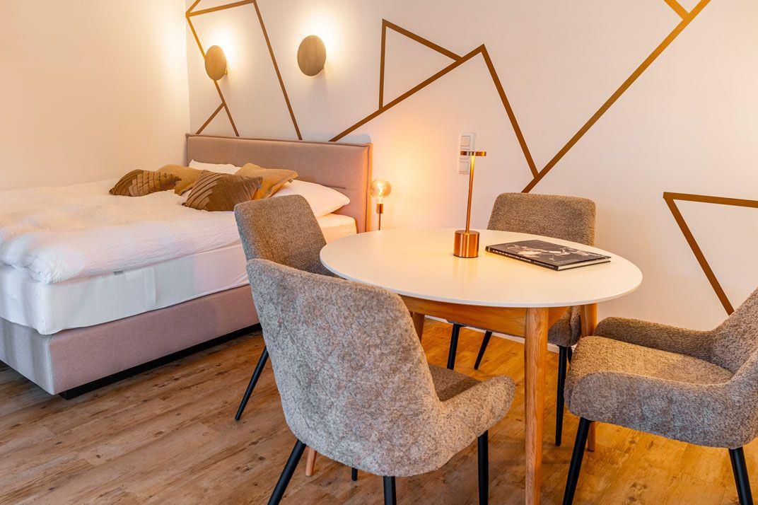 Die Ferienwohnung „Udo“ ist zwar nicht das Hotel Atlantik, doch der Panik-Rocker ist hier in tollen Details spürbar. Als weitere Besonderheit findet ihr in dieser Wohnung einen Raumtrenner mit einem integrierten, schwenkbaren Fernseher, ideal für gemütliche Filmabende auf dem Sofa oder im Bett. Die Farben sind angenehm für eure Augen: Beige, Creme und Taupe, kombiniert mit kupferfarbenen Akzenten, die sich in der Tapete widerspiegeln und der Wohnung einen edlen, rockigen Touch verleihen.