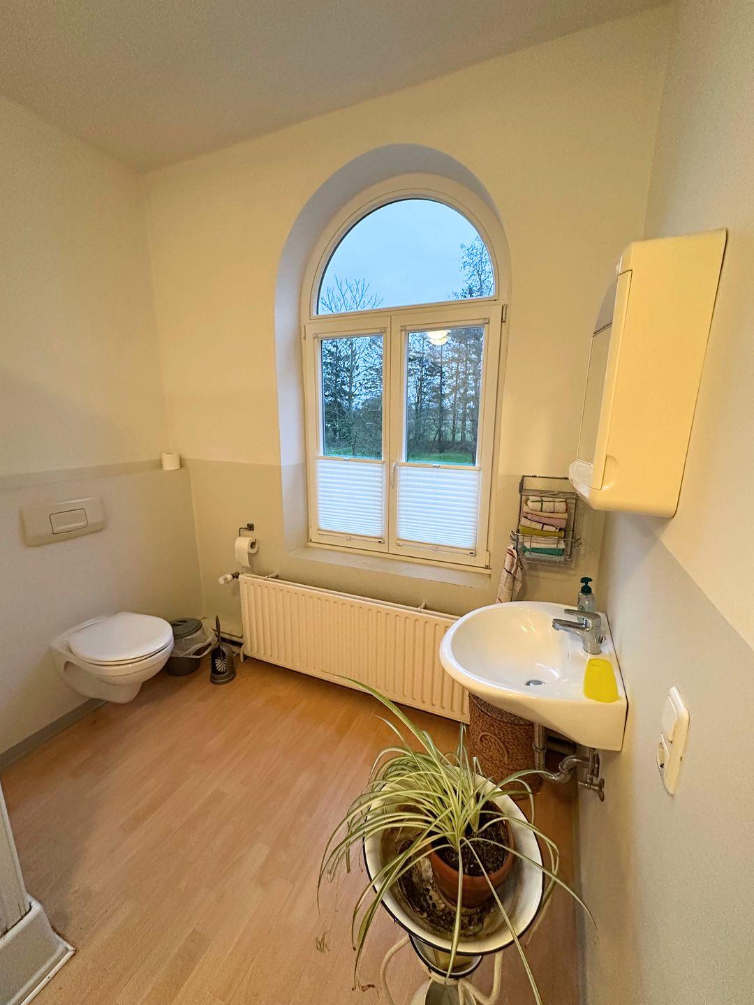 Schreibtisch mit 1 Stuhl und 1 Sessel. Das Badezimmer hat Waschbecken, WC, Dusche sowie Haartrockner.