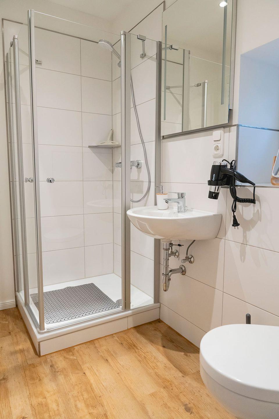 Esstisch mit 4 Stühlen, voll ausgestattete Küche mit Herd und Backofen, Spülmaschine, Kühlschrank, Töpfen, Pfannen, Geschirr, Besteck, Bechern, Gläsern, Kaffeemaschine, Wasserkocher und Toaster. Das Badezimmer hat Waschbecken, WC, Dusche sowie Haartrockner.