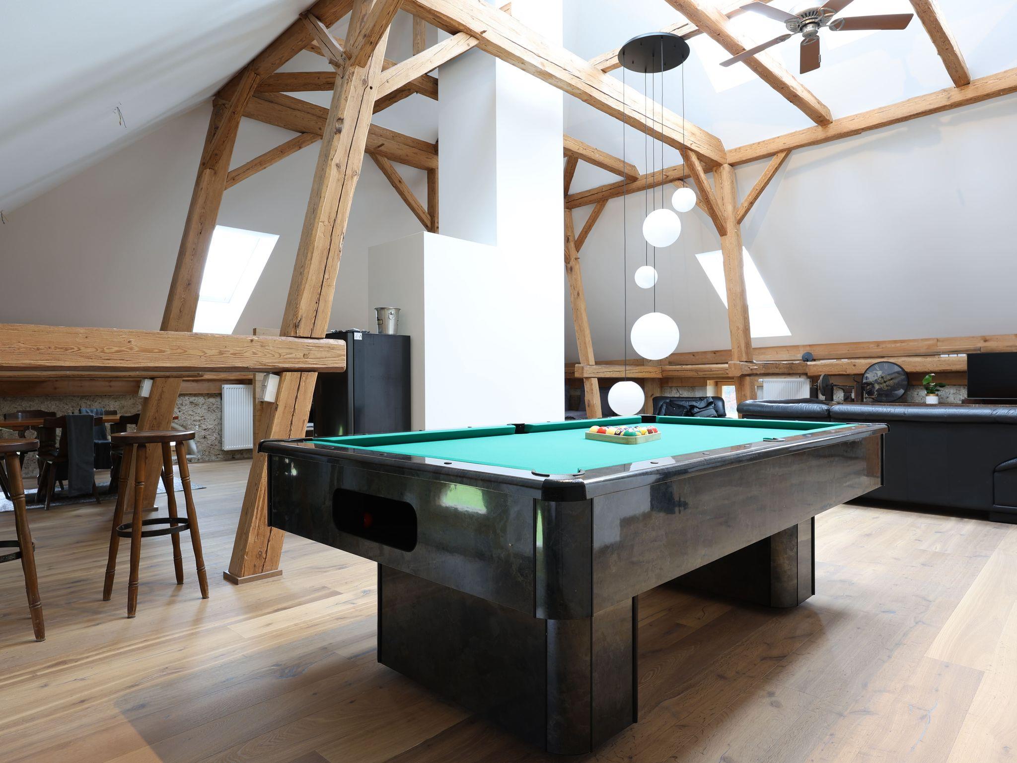 Es verfügt über eine voll ausgestattete Küche, einen gemütlichen Ess- und Wohnbereich, ein Schlafzimmer mit Flachbett und ein exklusives Rattan-Bett. Ein modernes Bad, eine Garderobe und ein Billardtisch runden das Loft ab und sorgen für ein besonderes Urlaubserlebnis.