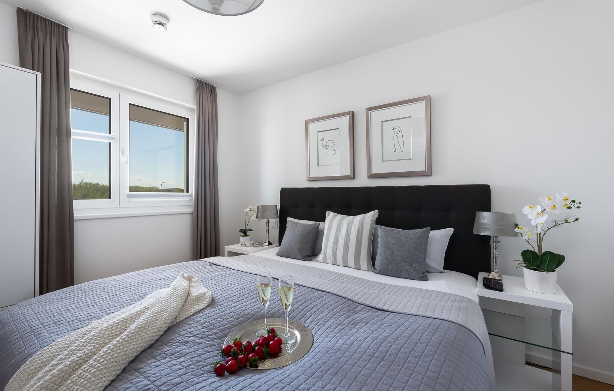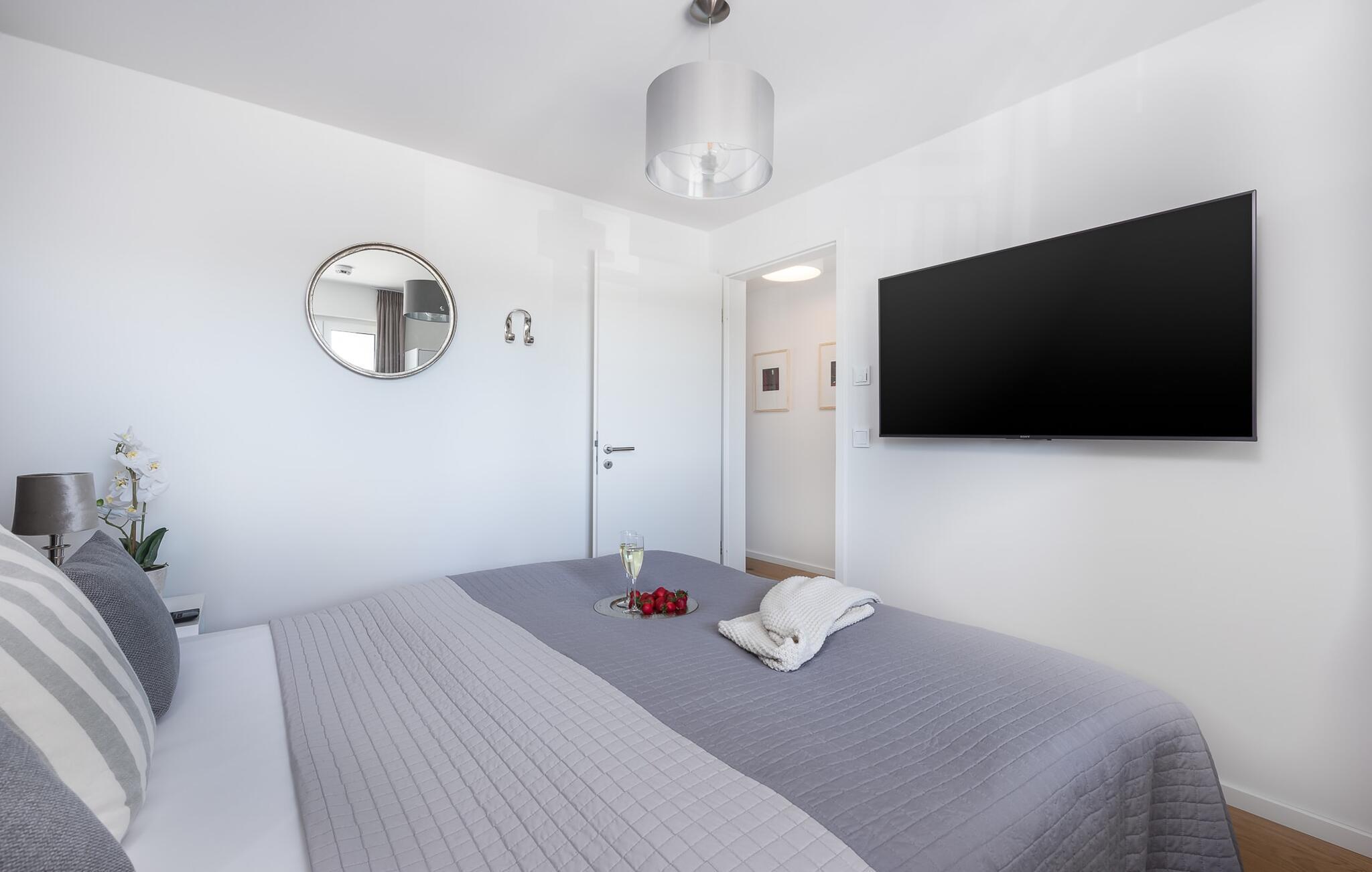 Diese komfortable Ferienwohnung bietet ein Schlafzimmer mit einem hochwertigen Doppelbett und einem zweiten Fernseher.